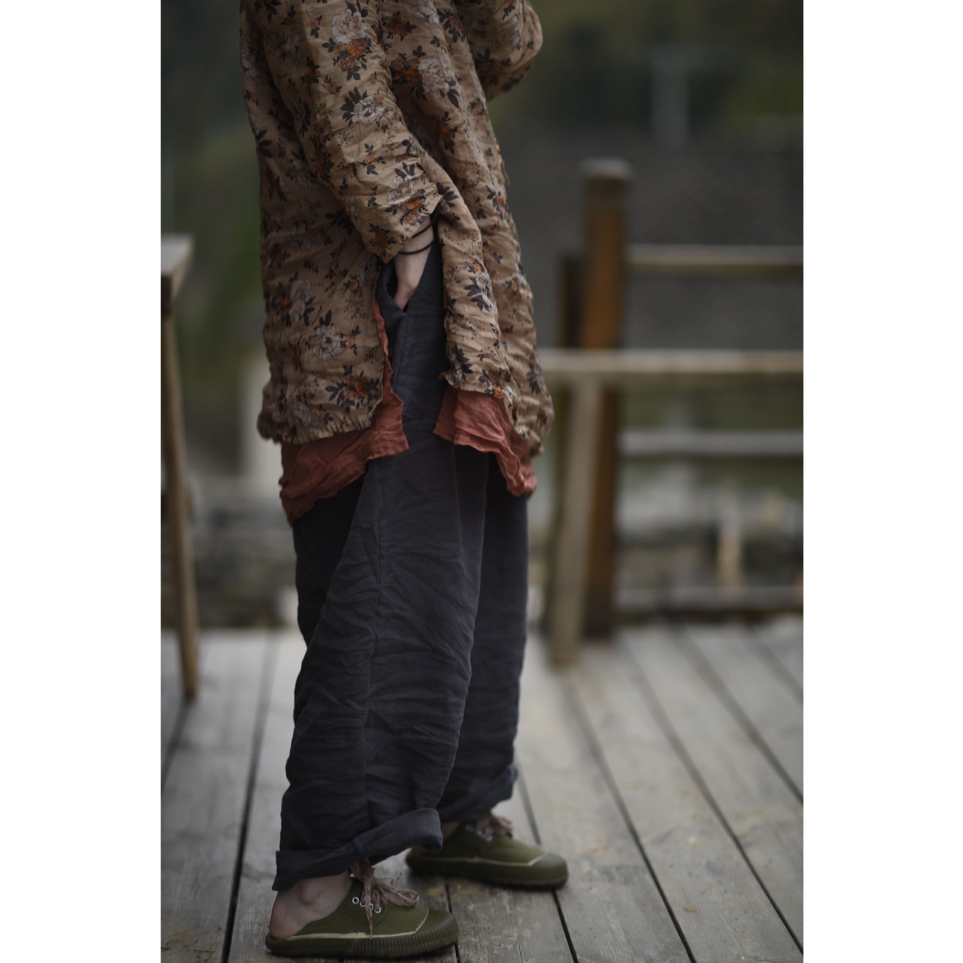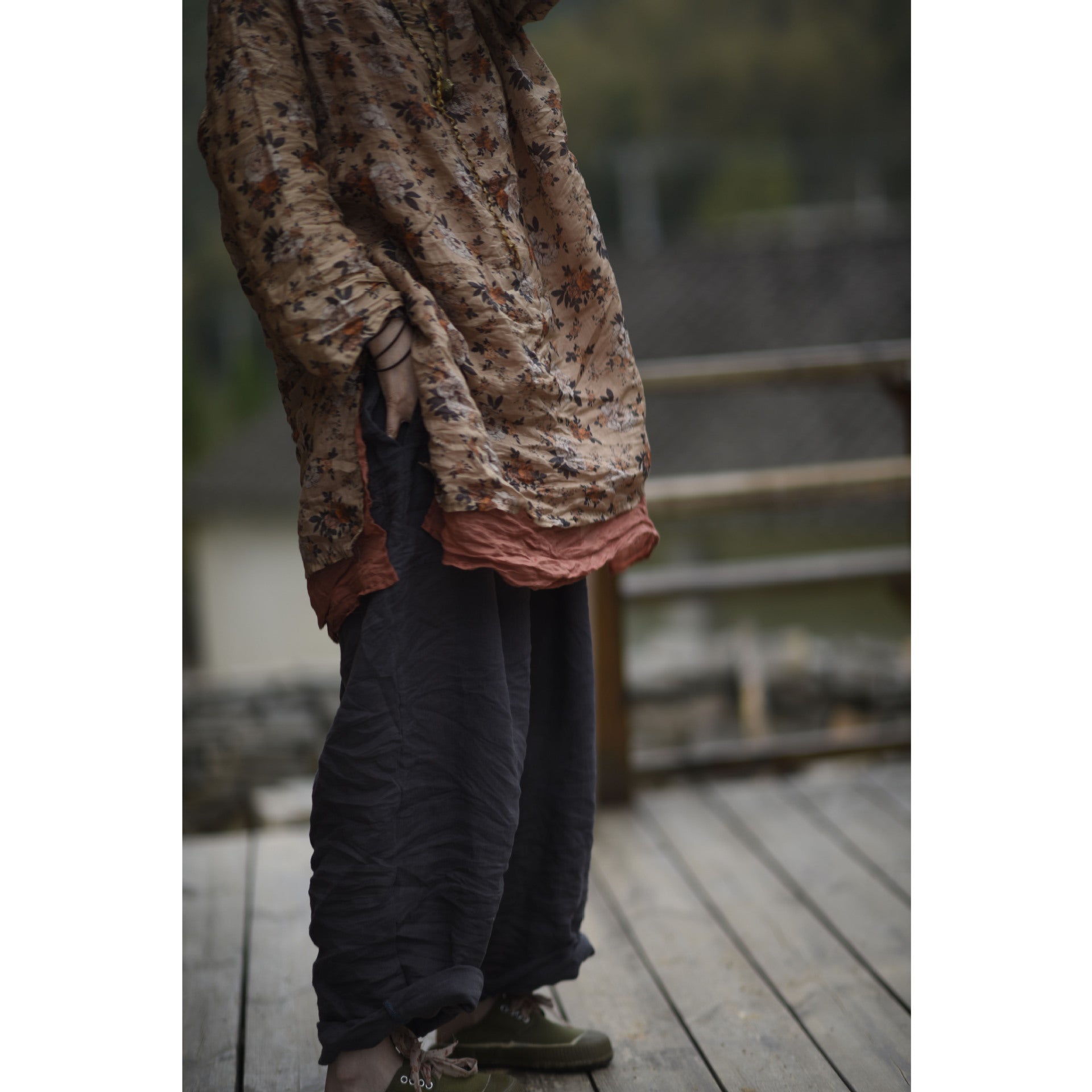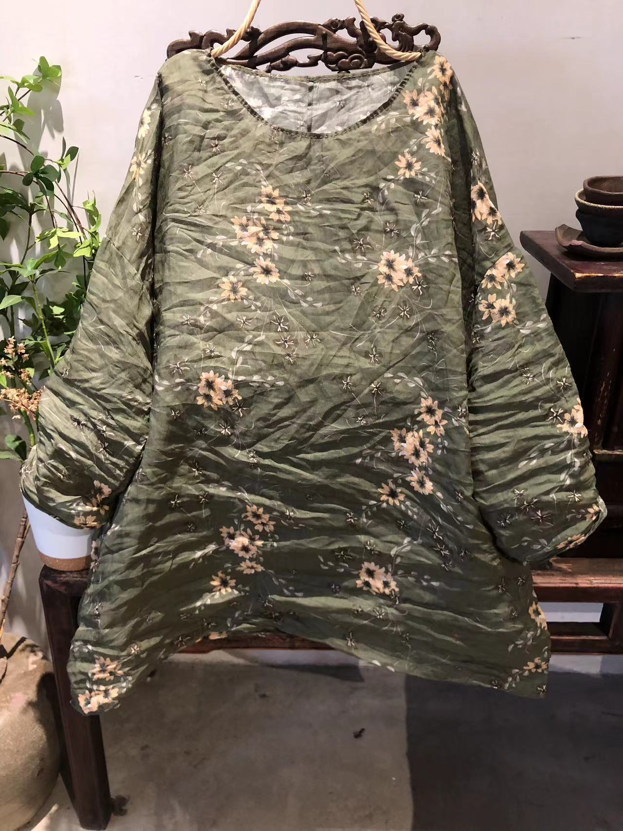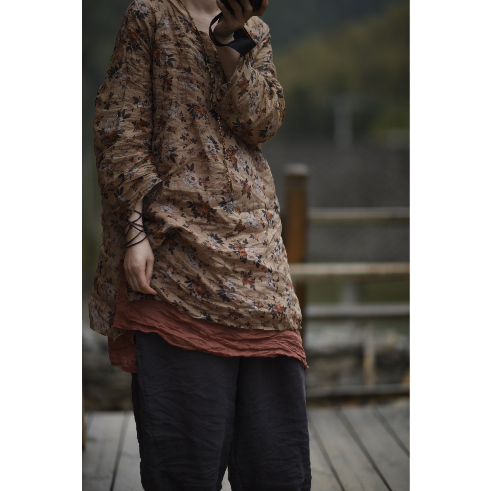 2025 23/4/Tea Ancient/Spring and Summer Literary Retro Ramie Printed Crew Neck Pullover Shoulder Medium Long Shirt