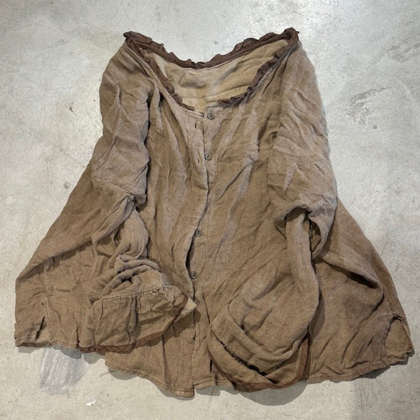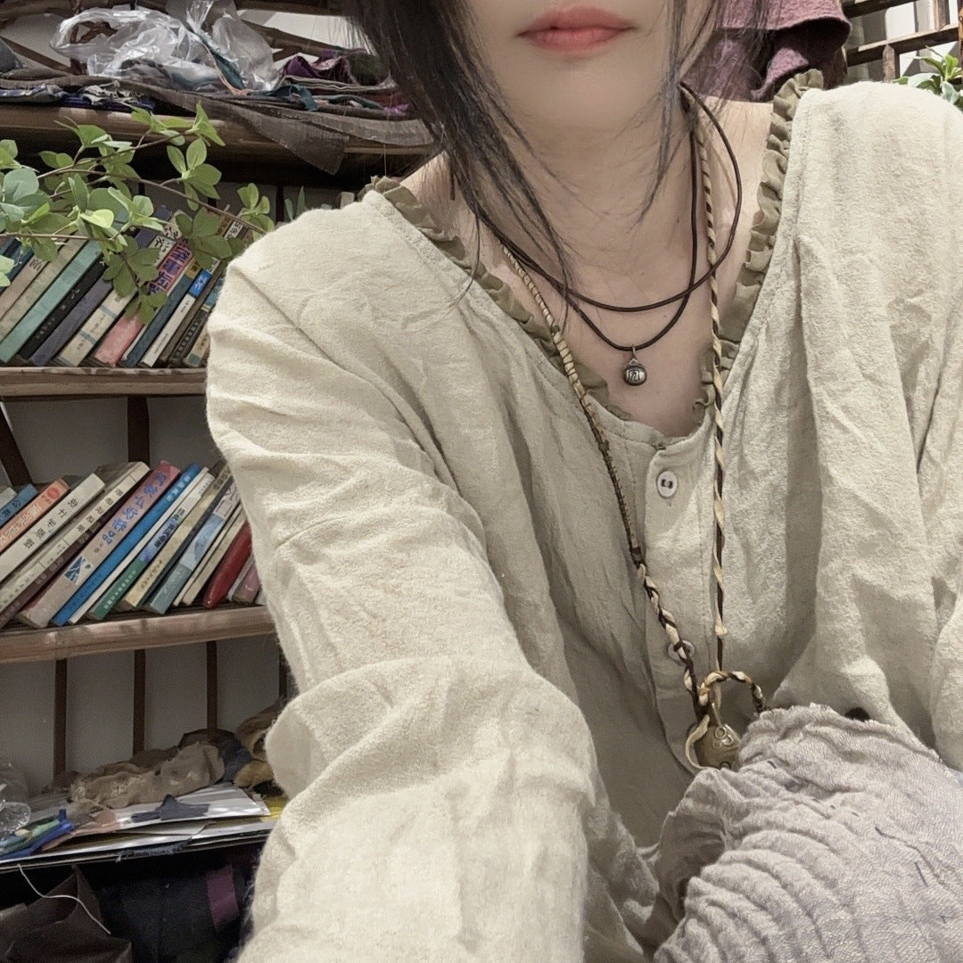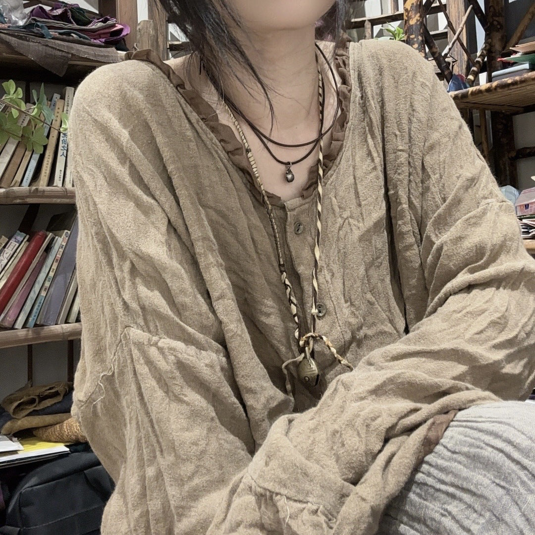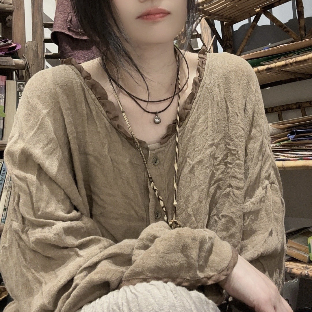 2025 24/4 SN41 literary and retro long-sleeved linen cotton smoked color craft fried old contrasting color lace neck cardigan shirt