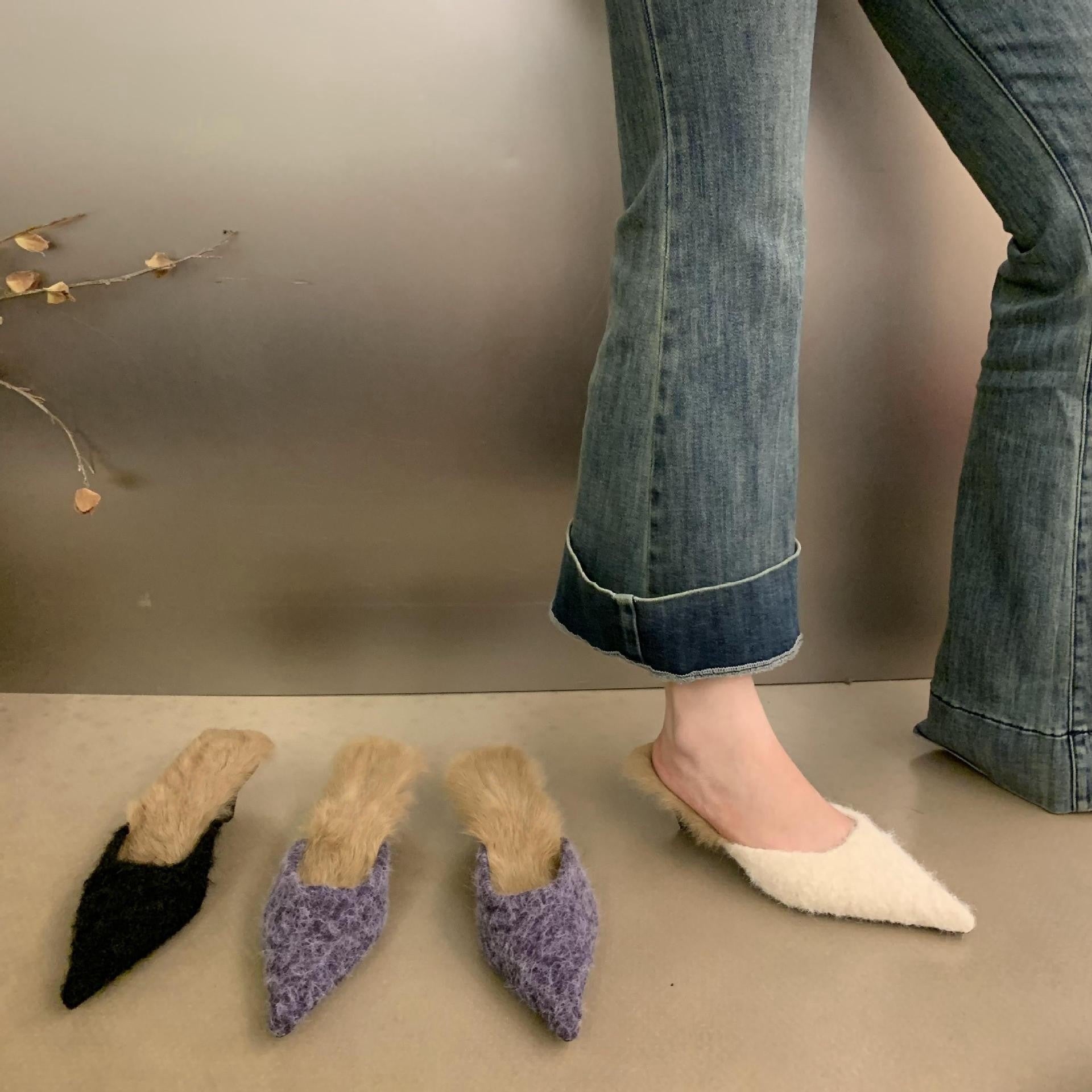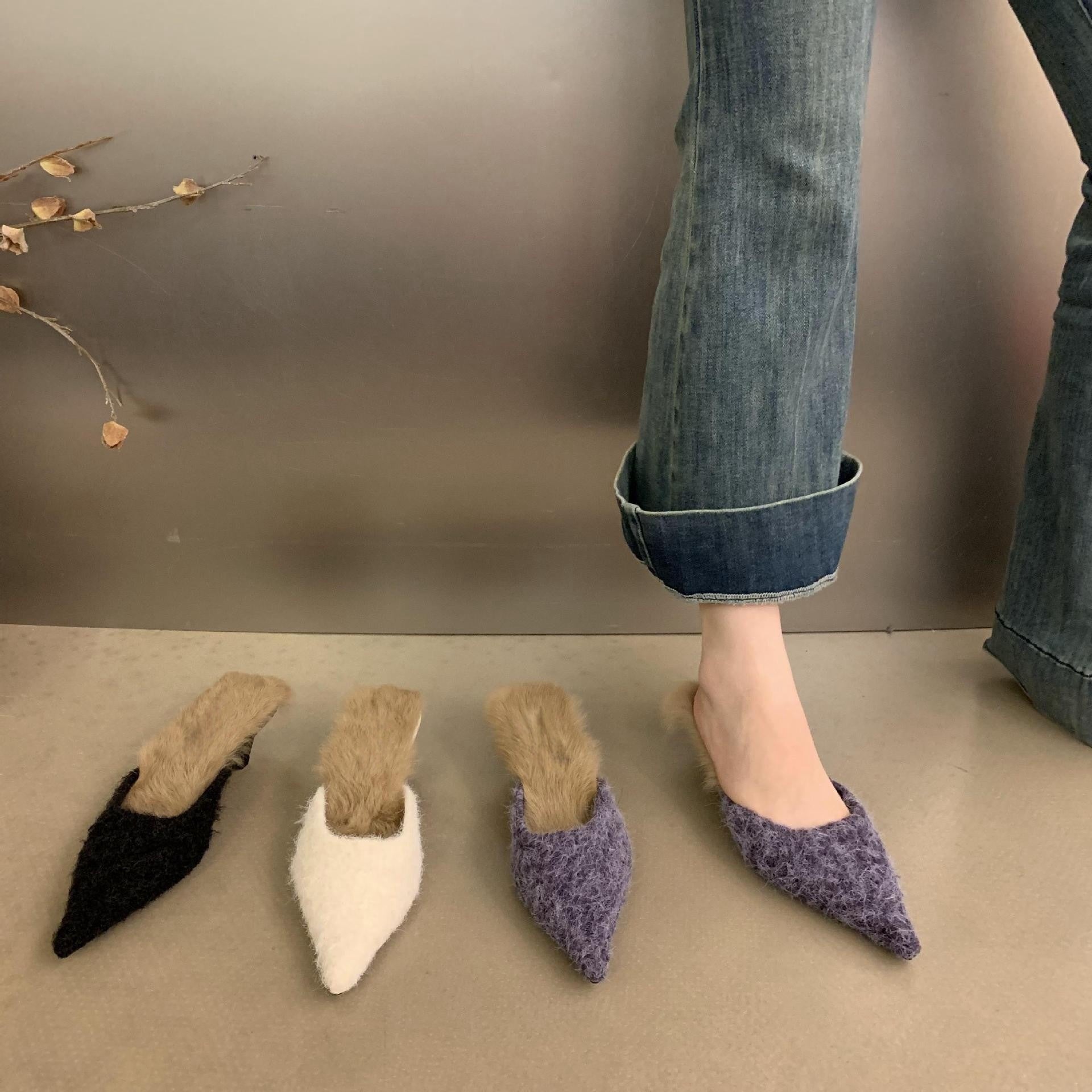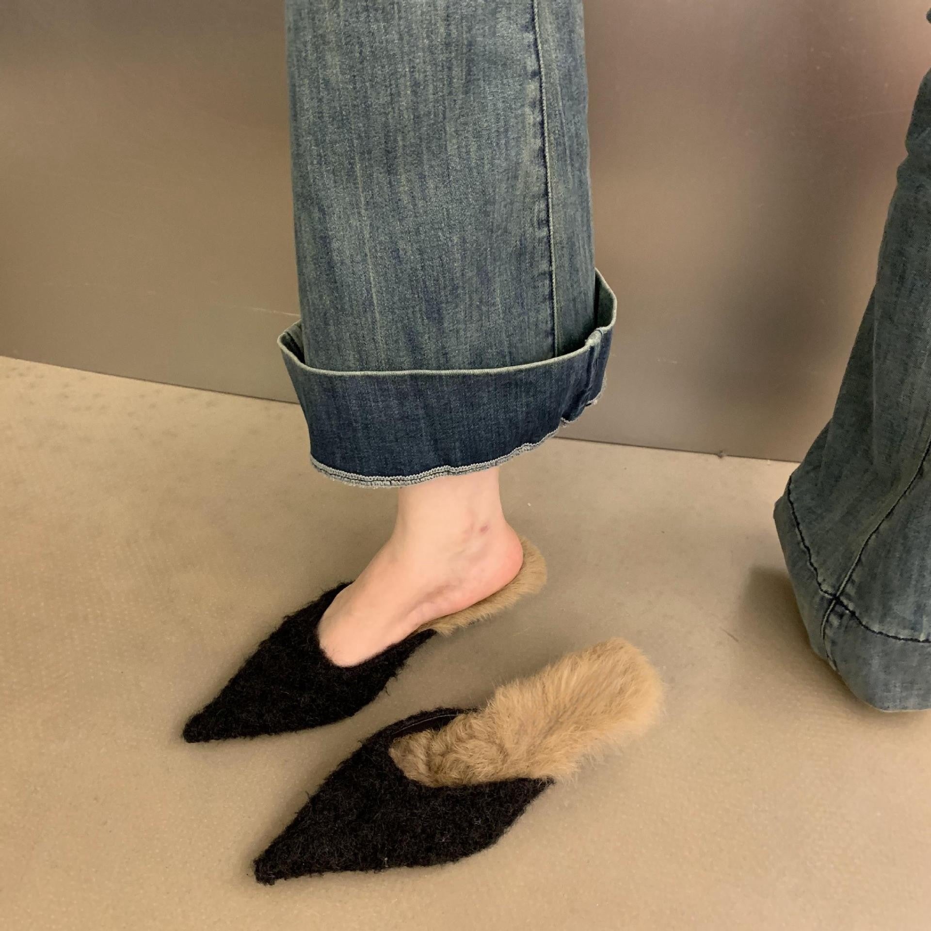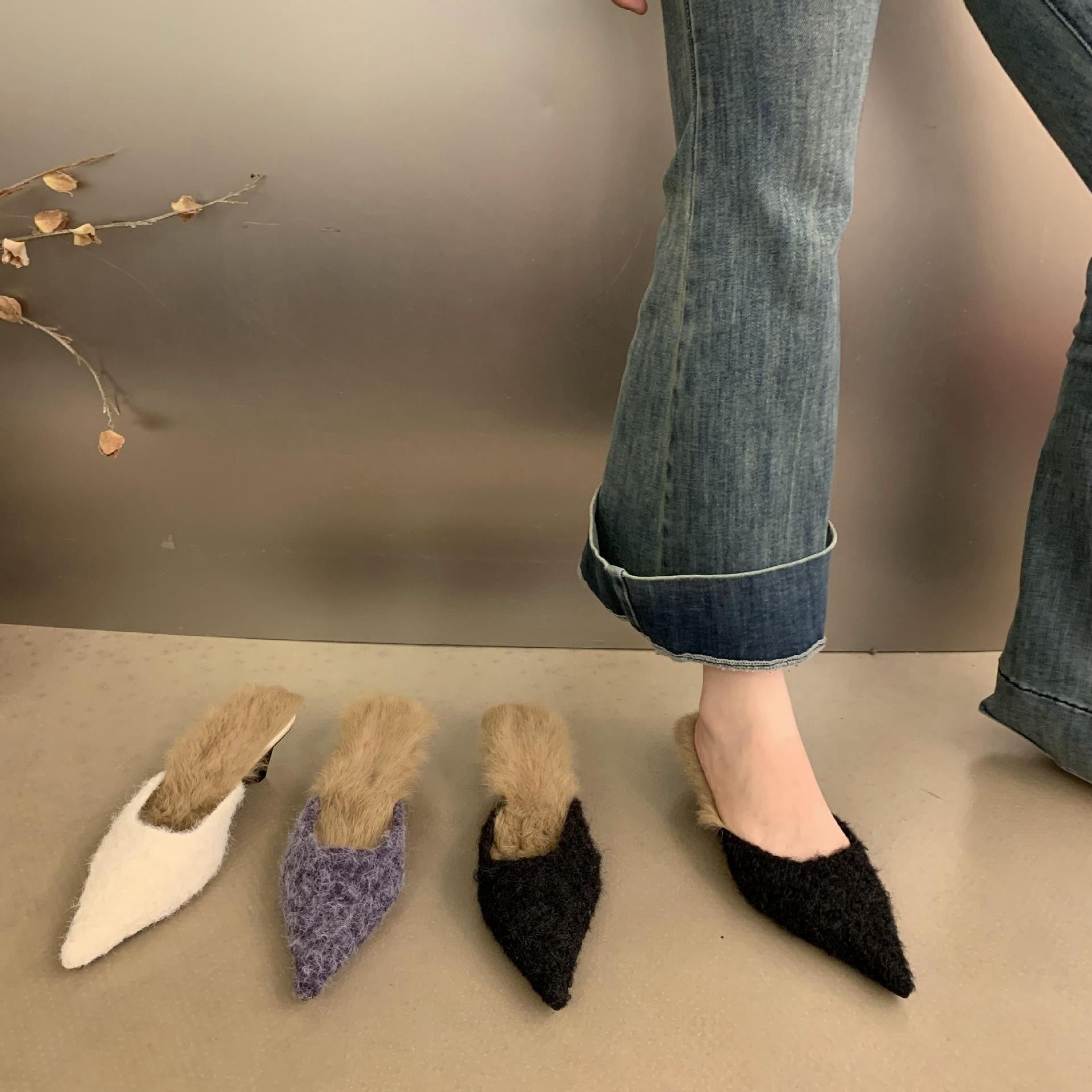2025 fluffy high heels cool slippers women's wear versatile pointed stiletto bag head Muller semi-drag bag foot sandals
