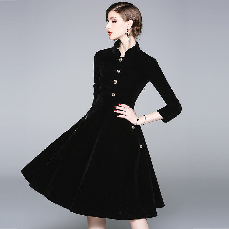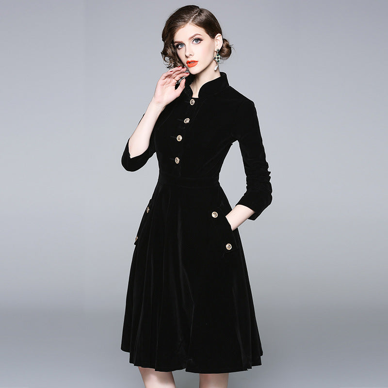 Black Hepburn stand-up collar gold velvet dress women's autumn and winter wear medium and long temperament coat coat