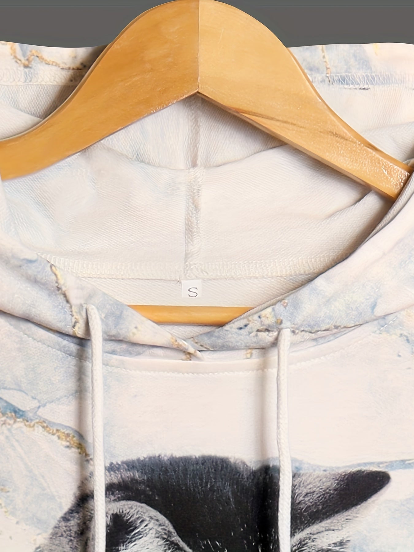 Cat Print Casual Sports Hooded Sweatshirs, Long Sleeve Drawstring Hoodie, Women's Sporty Sweatshirts