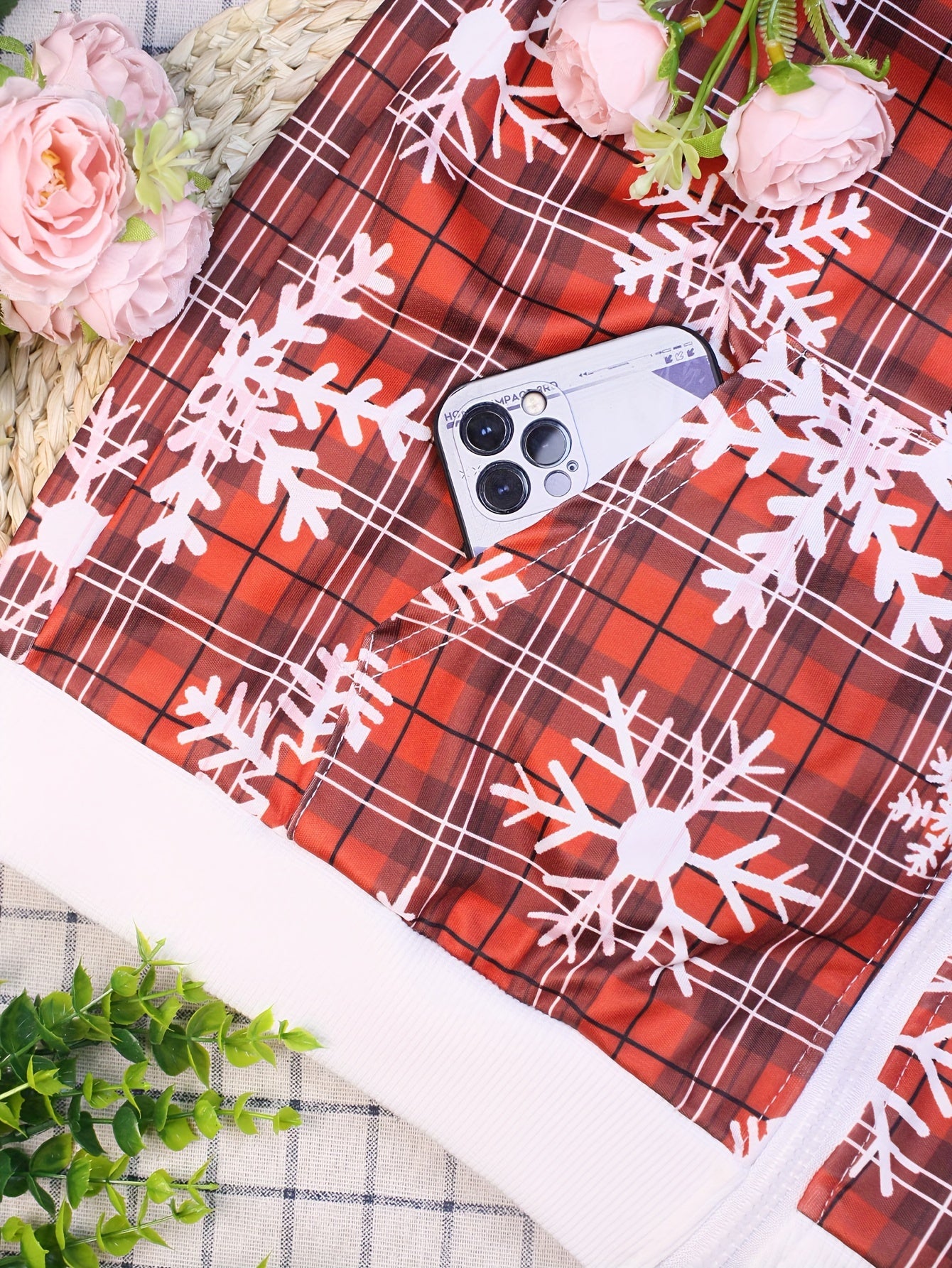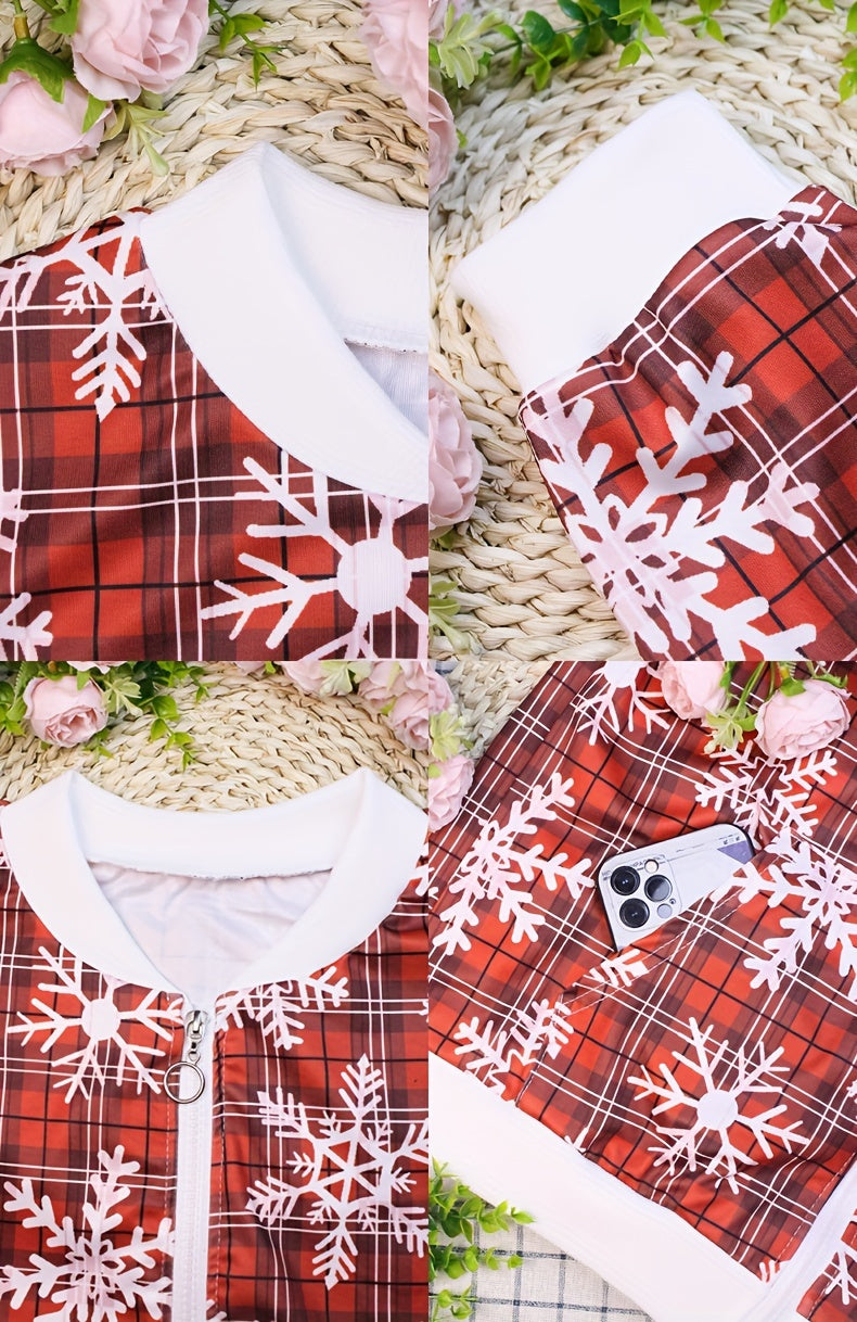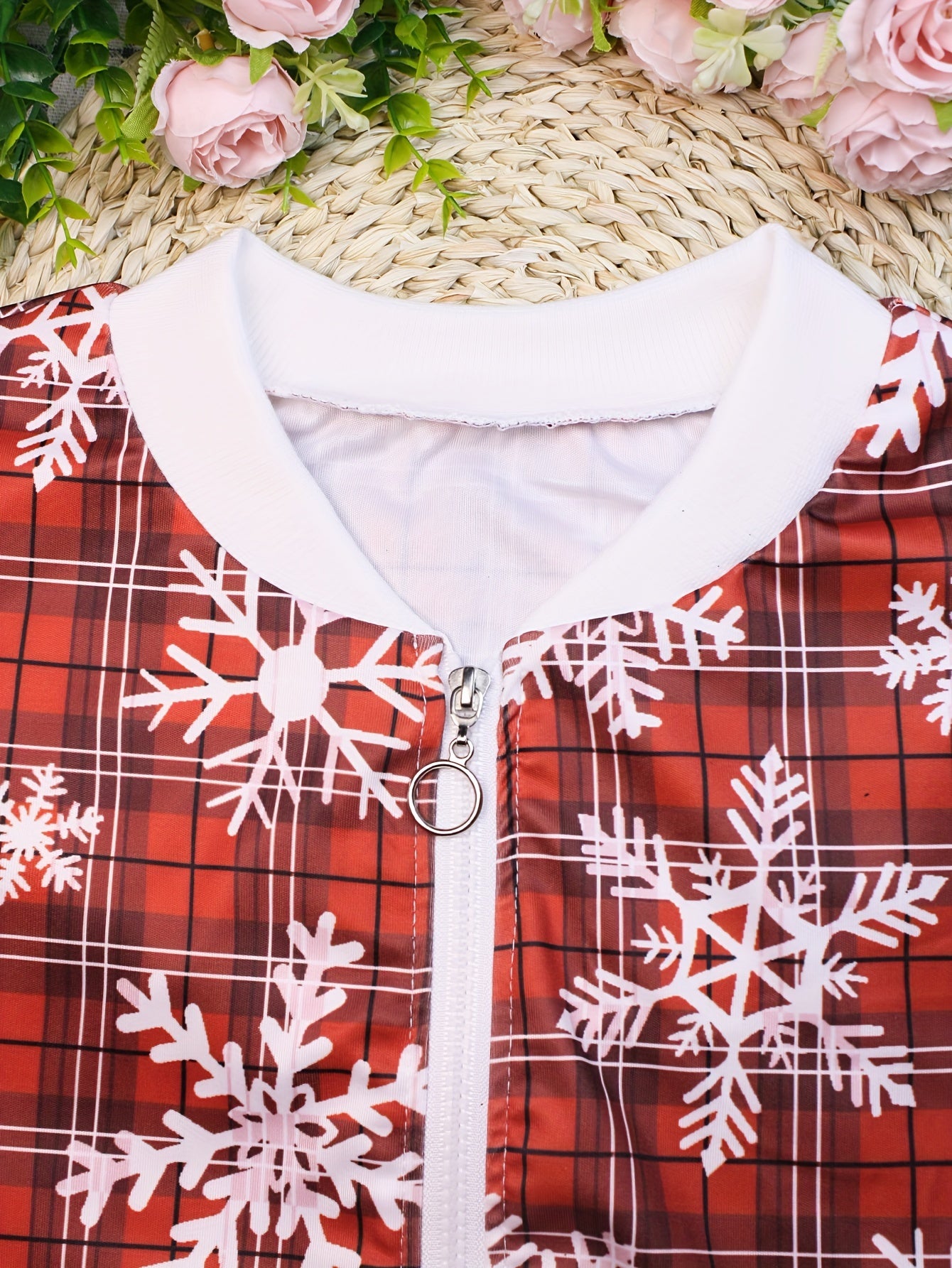 Chic Christmas Red Plaid & Snowflake Zip-Up Jacket - Casual Long Sleeve Outerwear for Women, Perfect for Spring & Fall