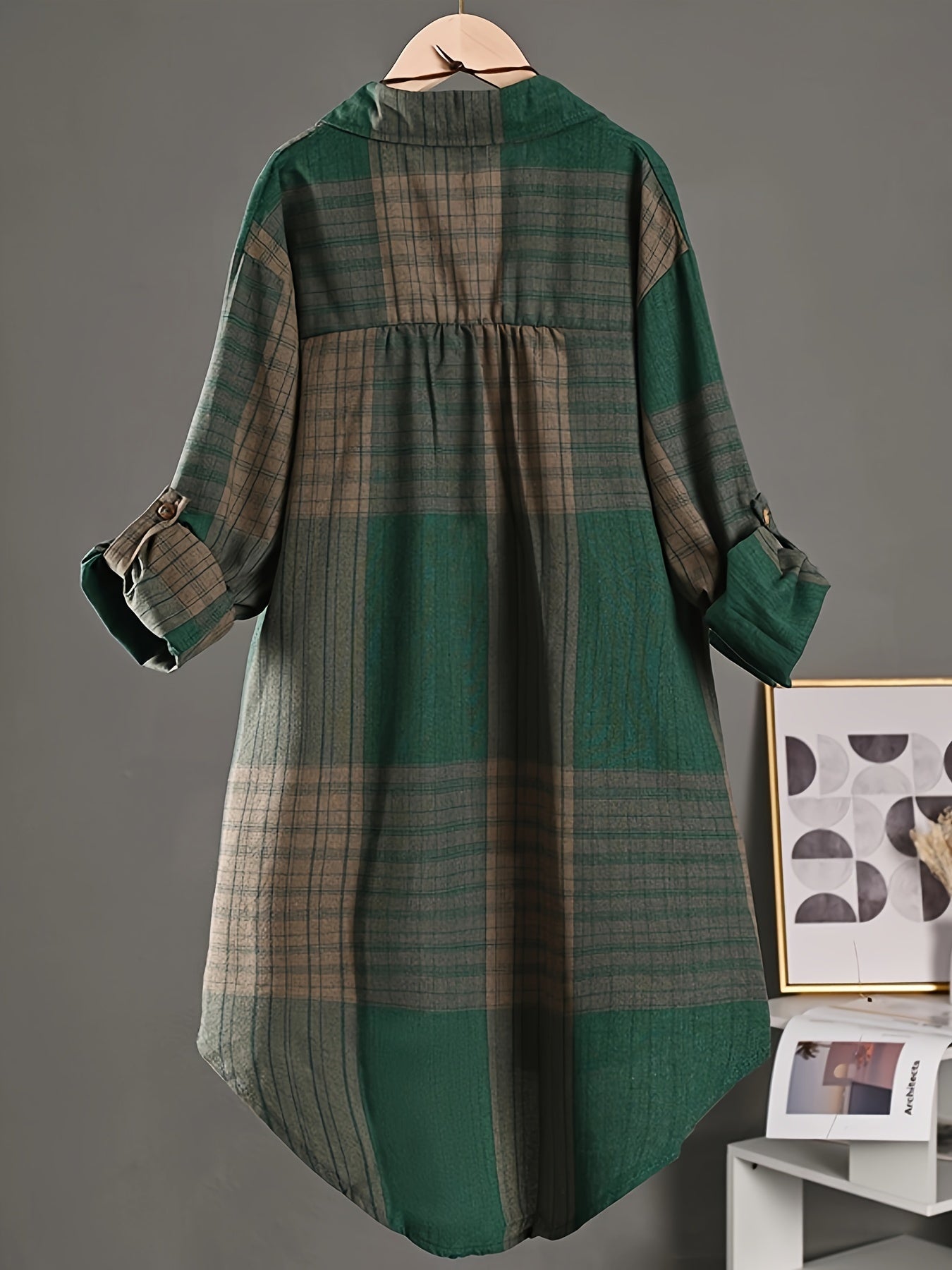 Colorblock Plaid Print Polo Collar Shirt, Casual Pocket Long Sleeve Shirt For Spring & Fall, Women's Clothing