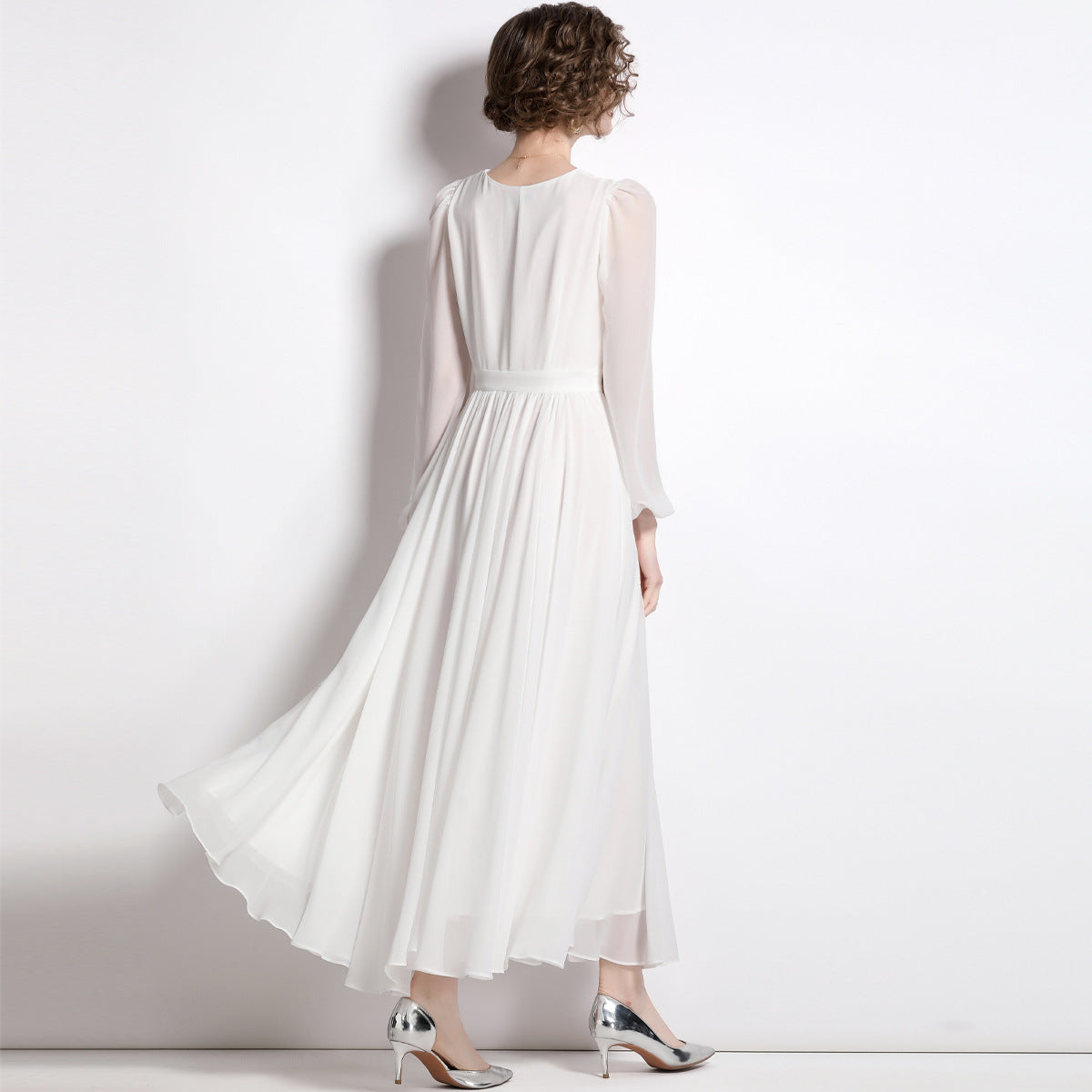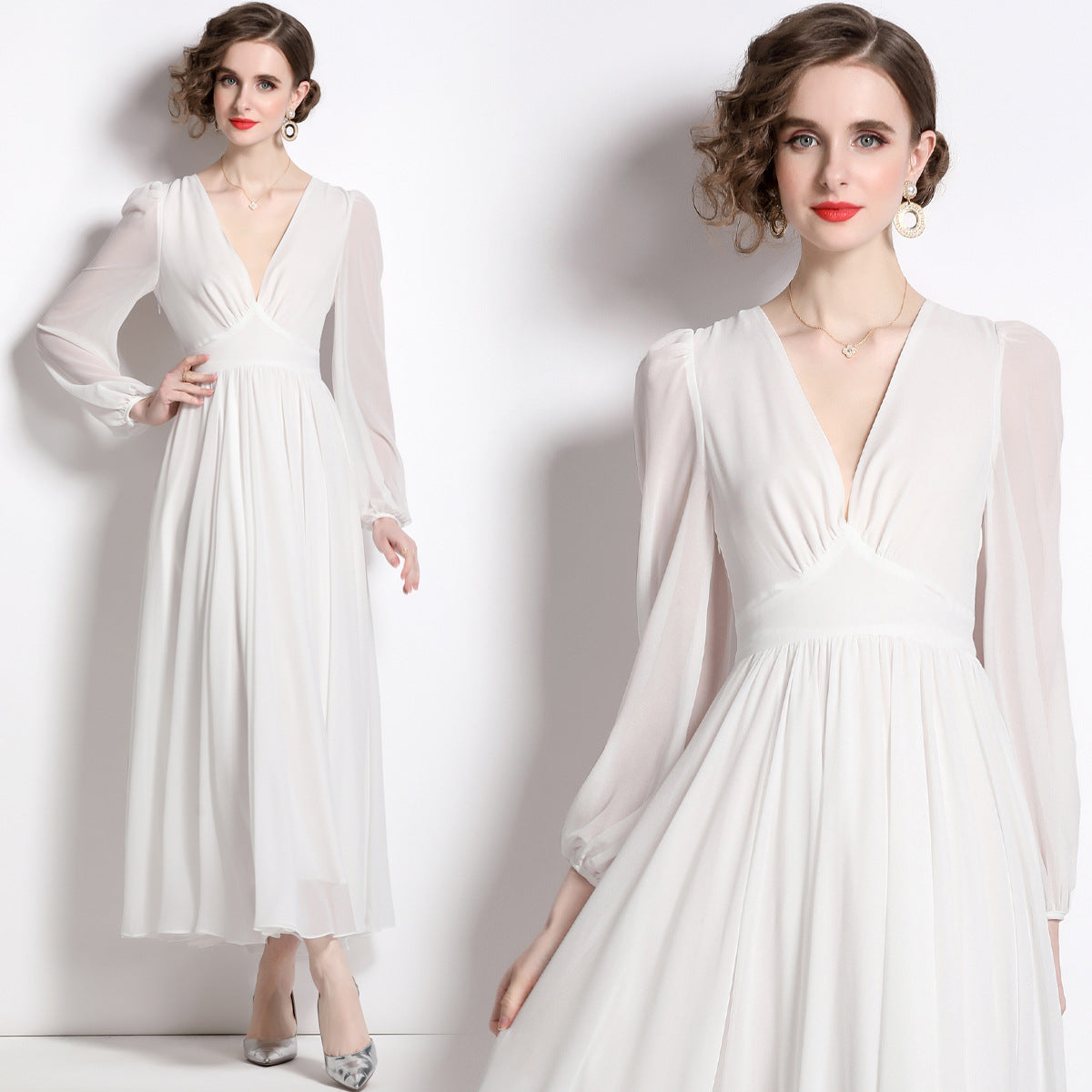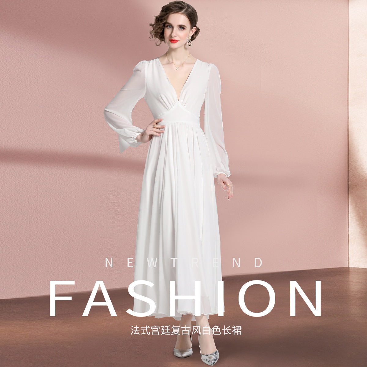 court retro style thin white dress V-neck long dress chic sweet and spicy skirt fairy dress