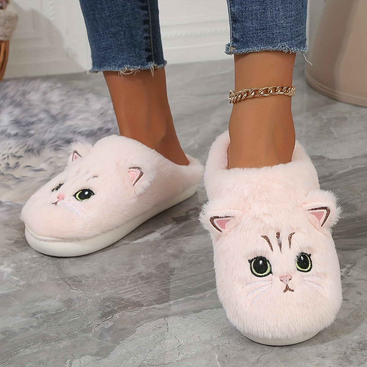 Cute Cartoon Cat Fuzzy Slippers, Creative Closed Toe Soft Sole Plush Flat Shoes, Winter Warm Home Slippers