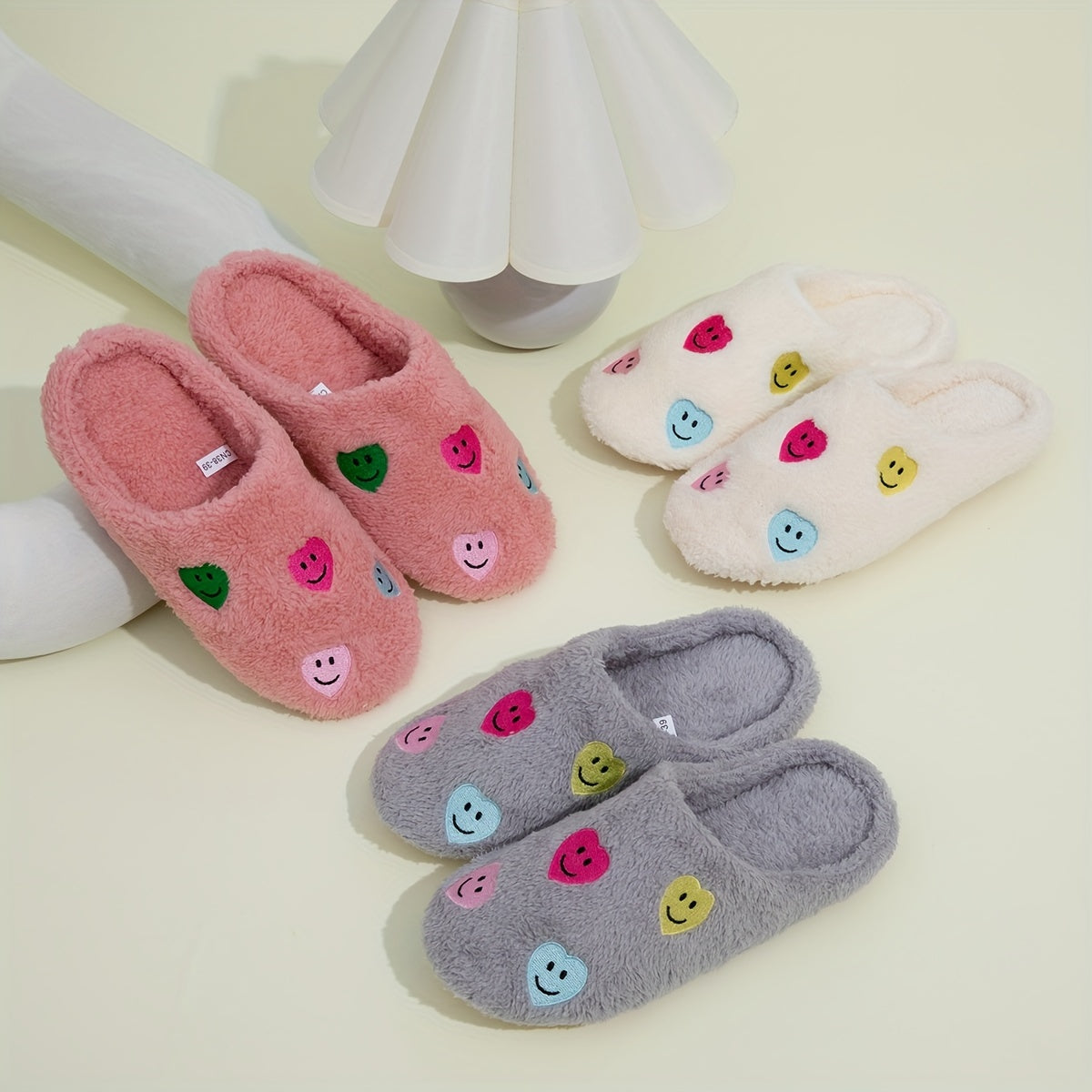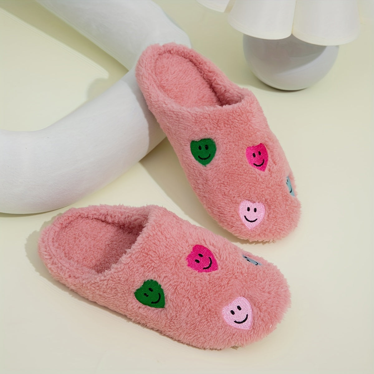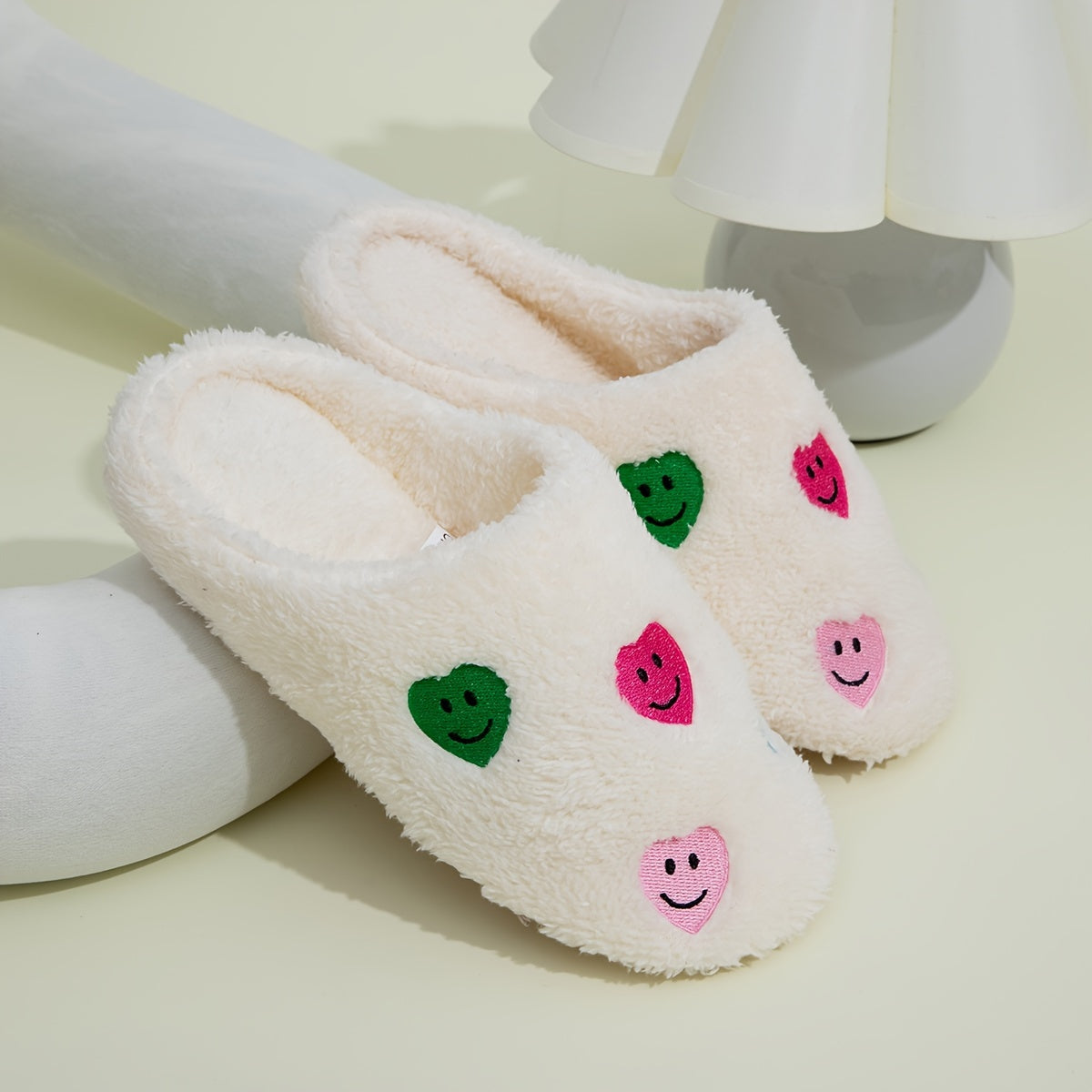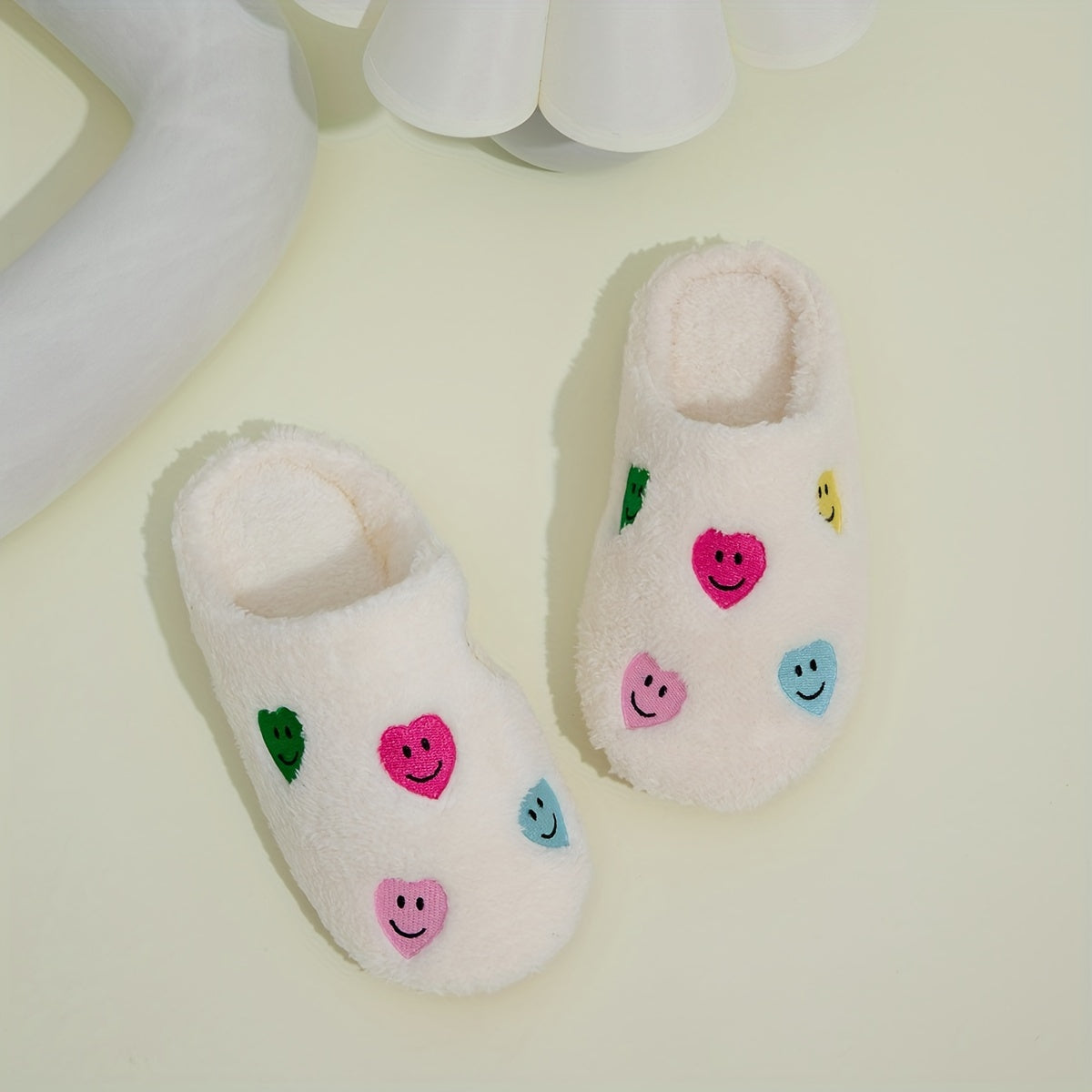 Cute Heart Smile Face Plush Slippers, Cozy & Warm Backless Flat Home Shoes, Valentine's Day Indoor Floor Slippers