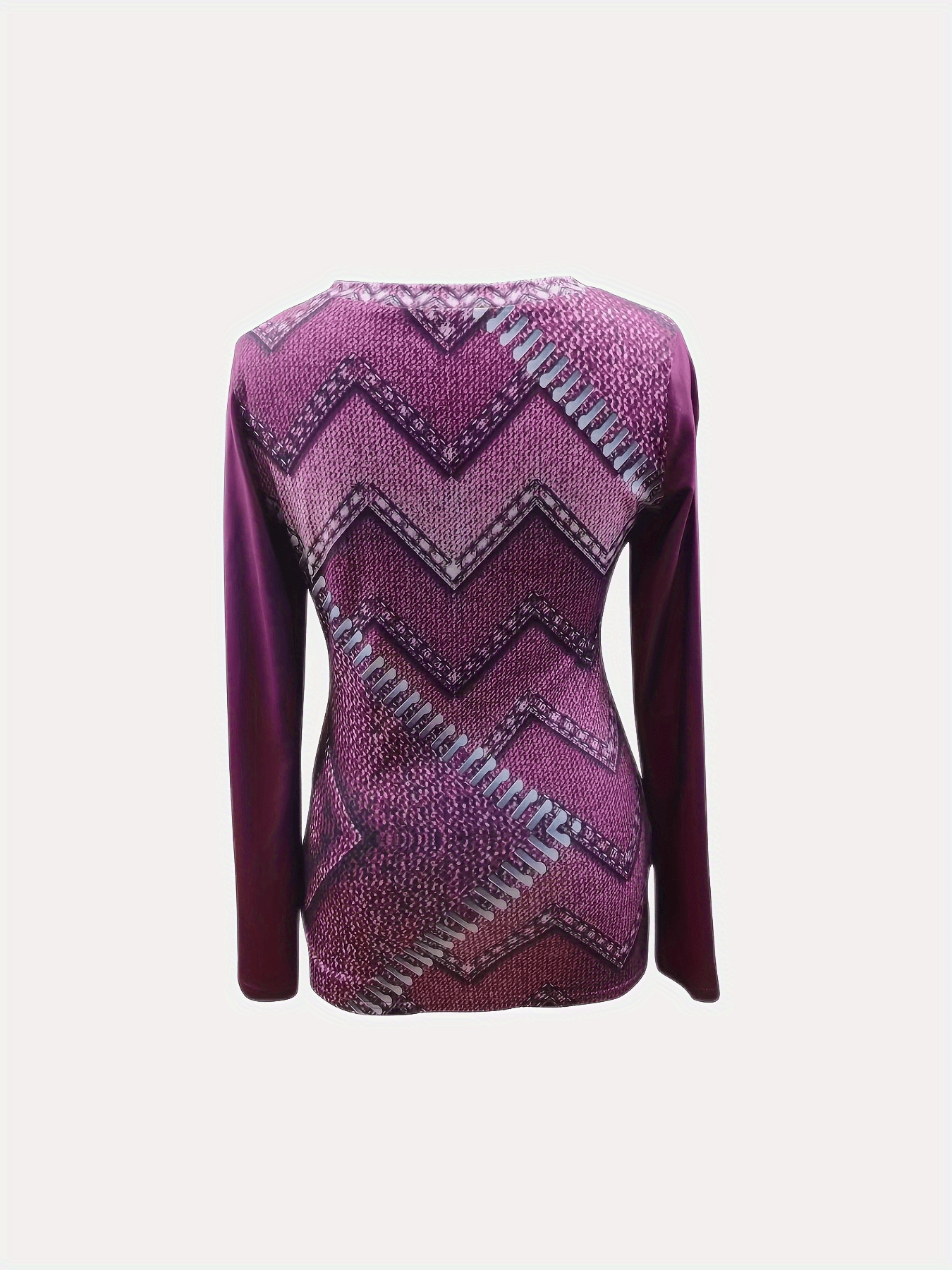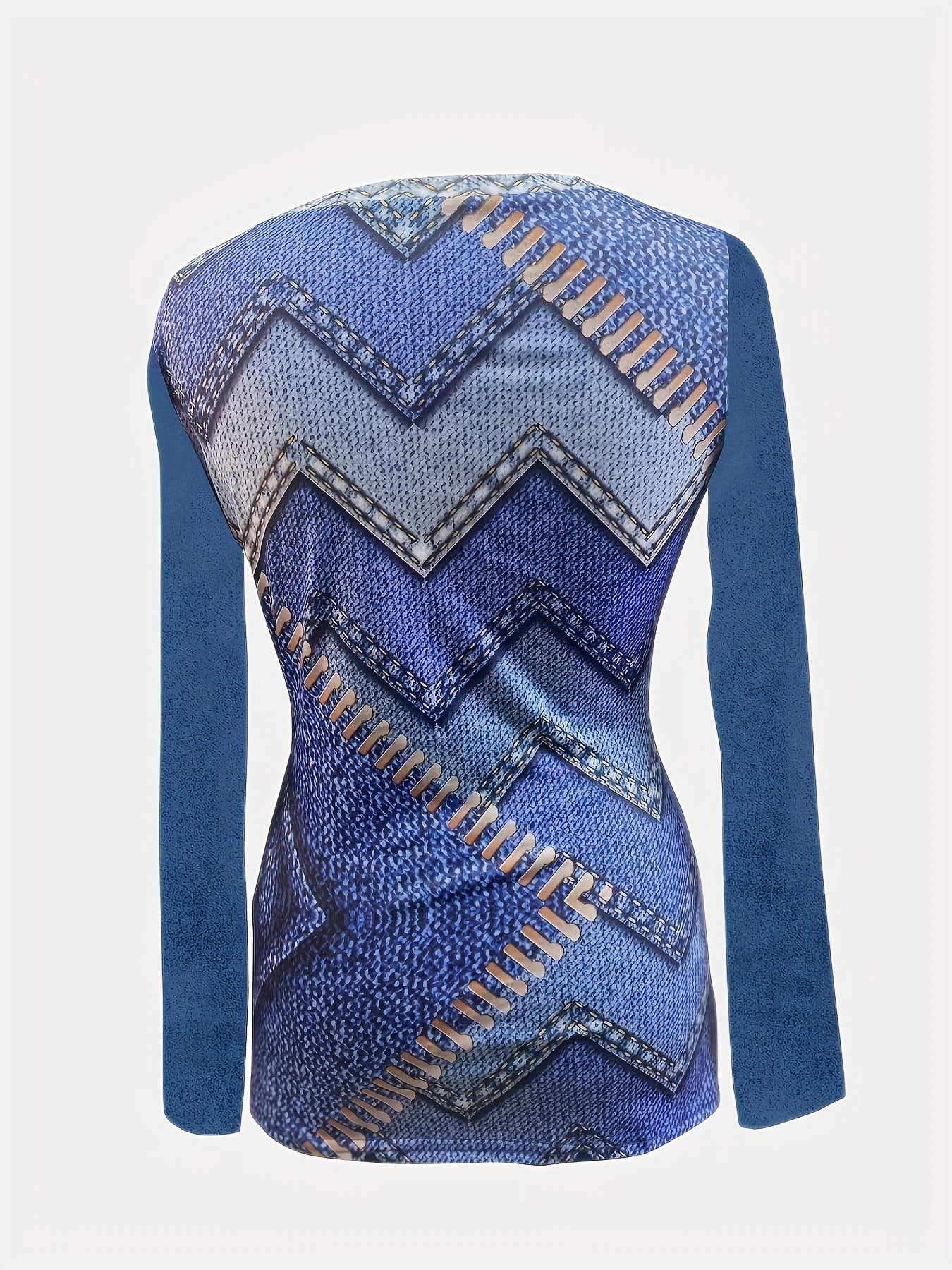 Denim Print Crew Neck Keyhole T-Shirt, Casual Long Sleeve T-Shirt For Spring & Fall, Women's Clothing