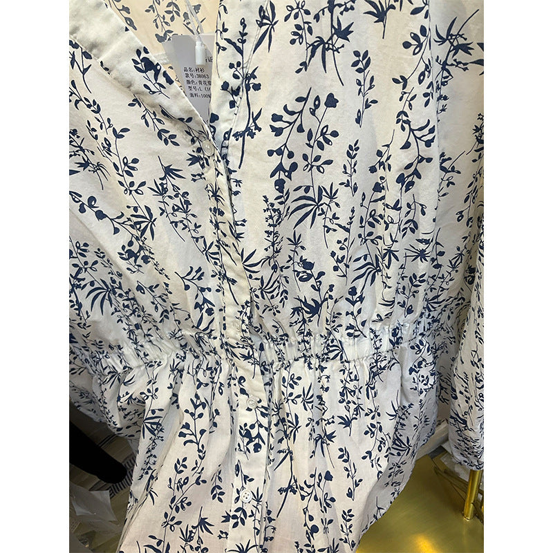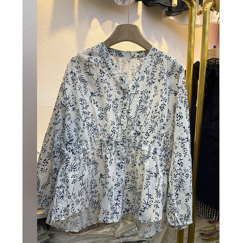 direct sales blue and white porcelain floral shirt women's long sleeves popular spring clothes new V-neck loose top pure cotton shirt
