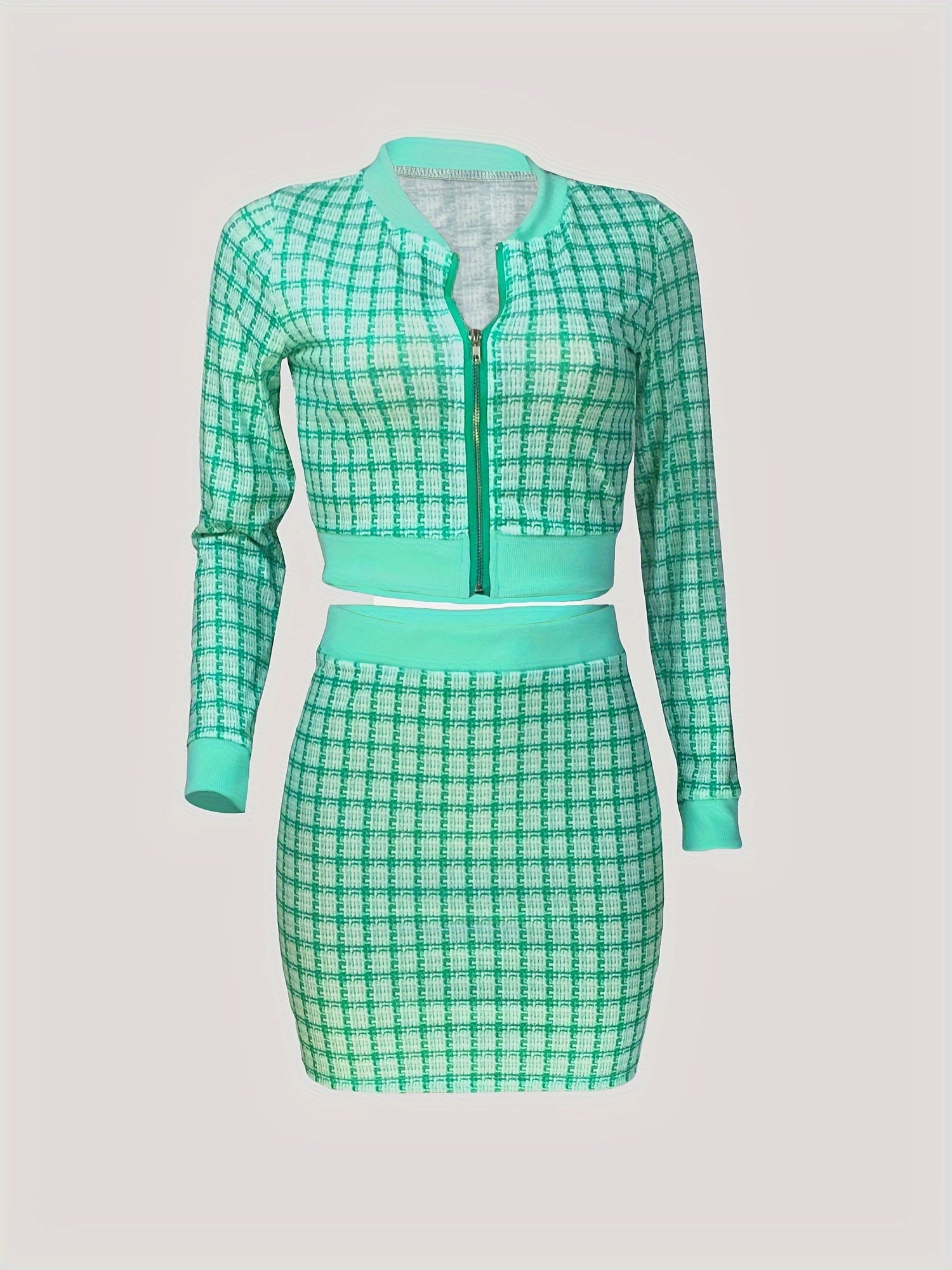 Elegant Plaid Matching Two-piece Set, Crop Zip Up Jacket & Bodycon Skirt Outfits, Women's Clothing