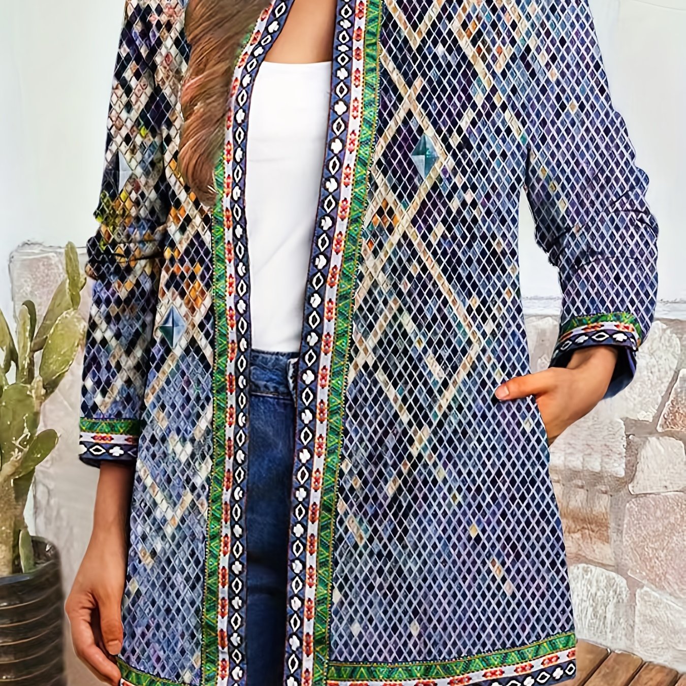 Ethnic Print Open Front Jacket, Vintage Long Sleeve Crew Neck Outerwear, Women's Clothing