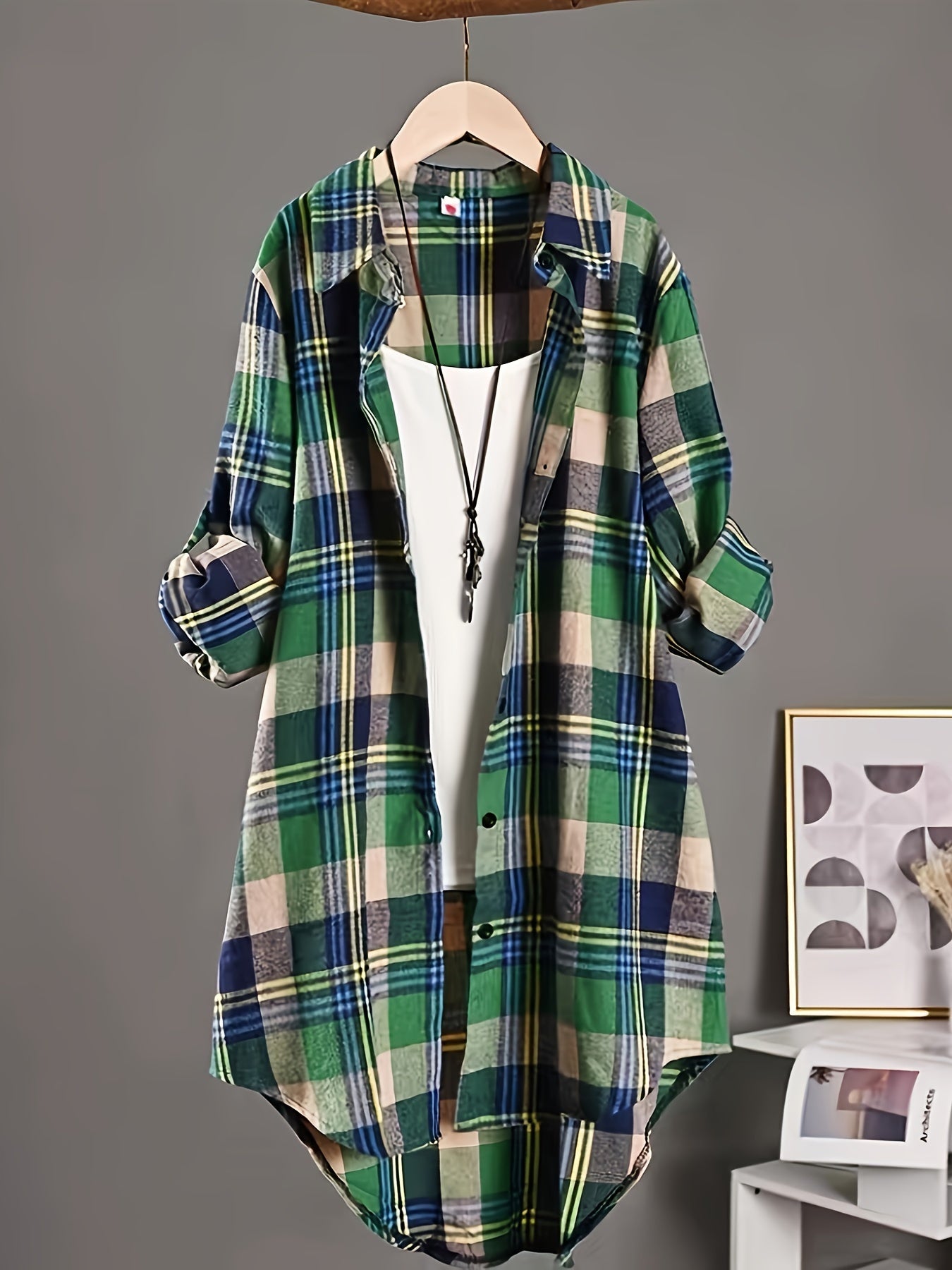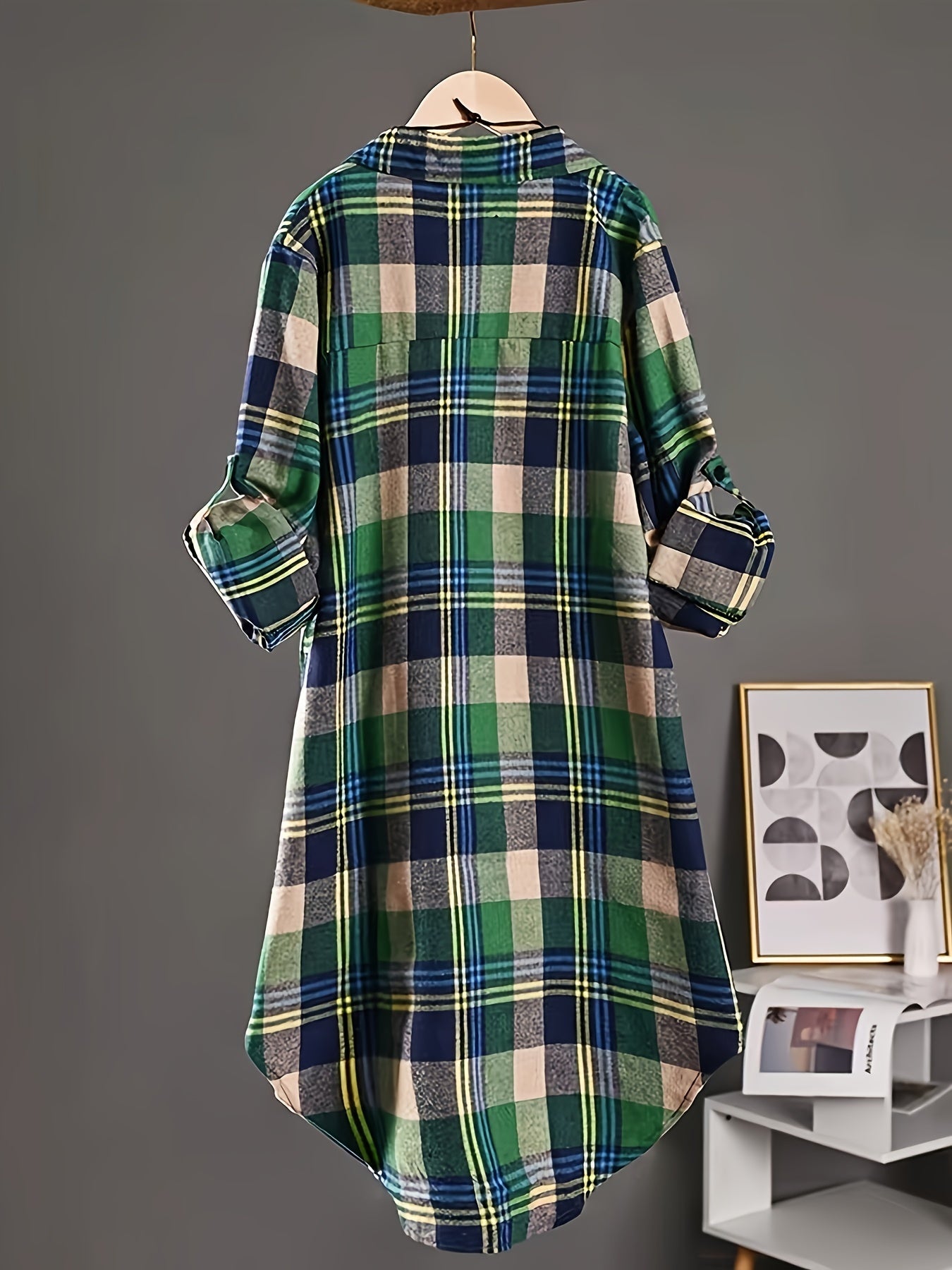 Flattering Plus Size Plaid Blouse for Curvy Women - Stylish Casual Wear with Roll Up Sleeves and Turn Down Collar - Trendy Button Up Print Top