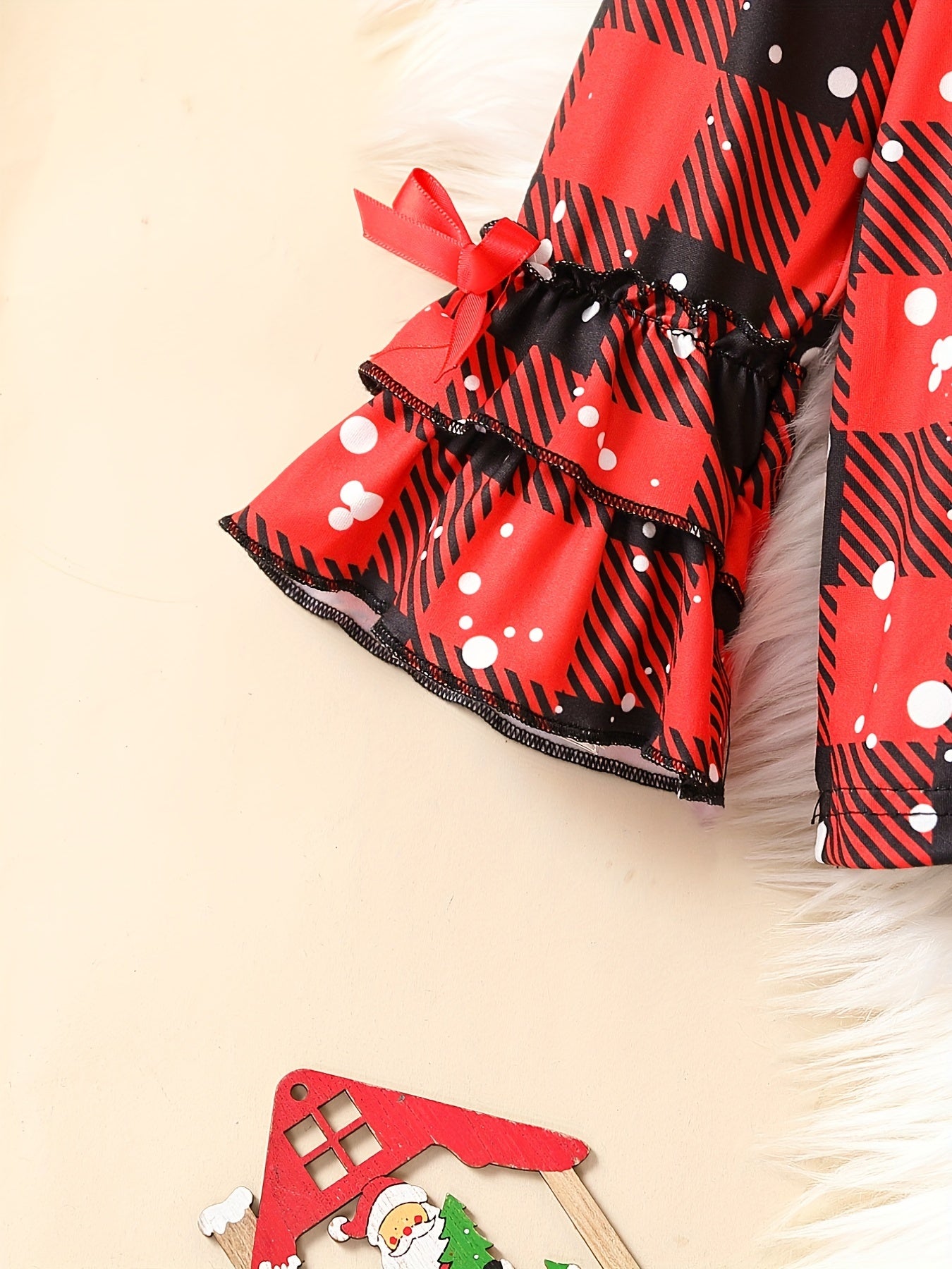 Girl's 2pcs Long Sleeve Top & Flared Pants Set, MERRY CHRISTMAS Santa Print Ruffle Decor, Plaid Pattern Trendy Casual Outfits, Kids Clothes For Spring Fall Winter, Outdoor Clothing