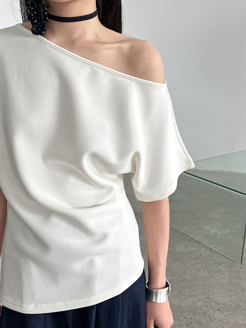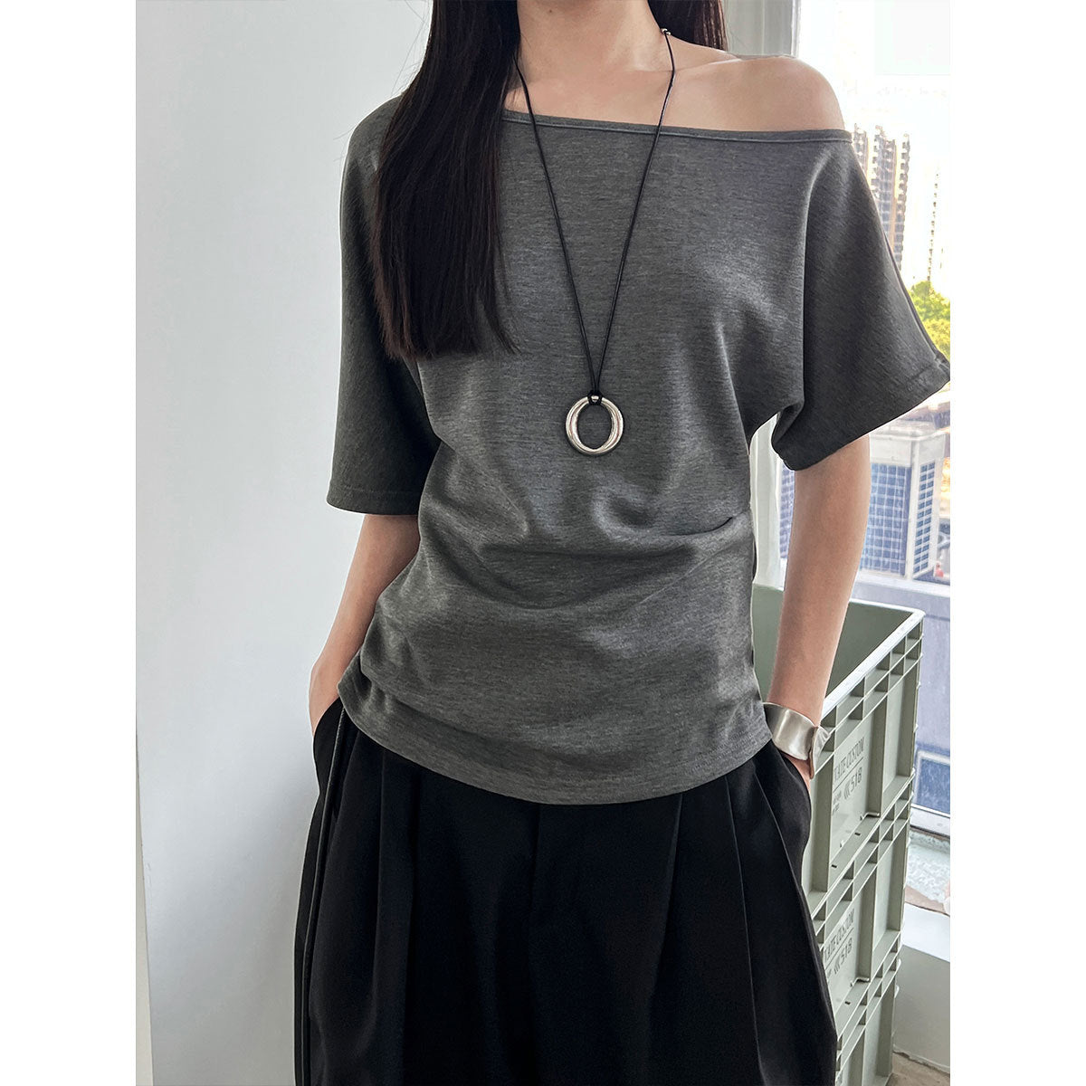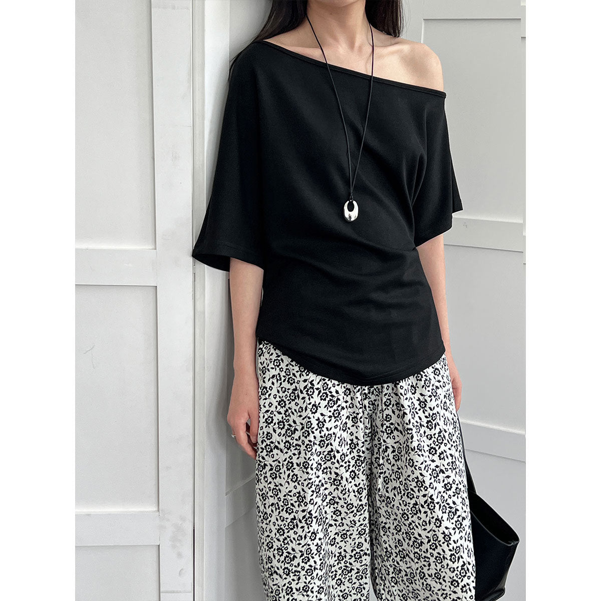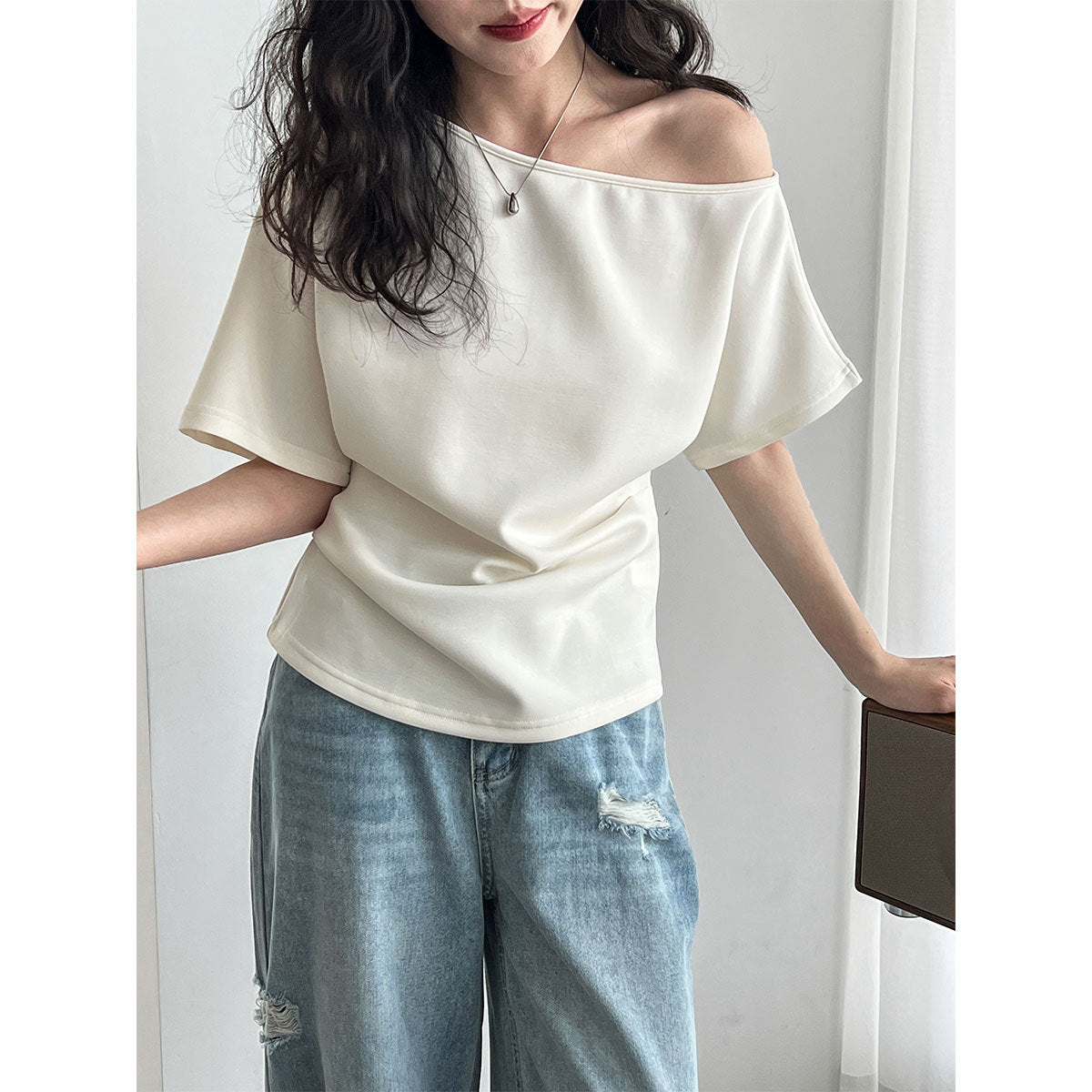 Lu Xi, lazy slanted shoulders loose short-sleeved women's summer new off-shoulder asymmetrical waist and thin T-shirt 2658