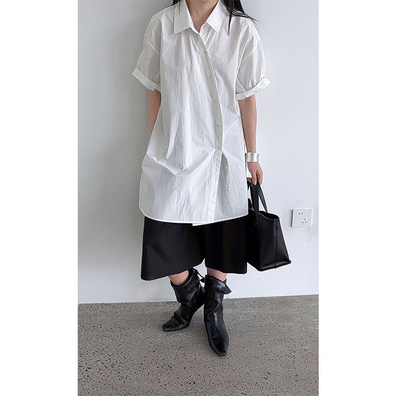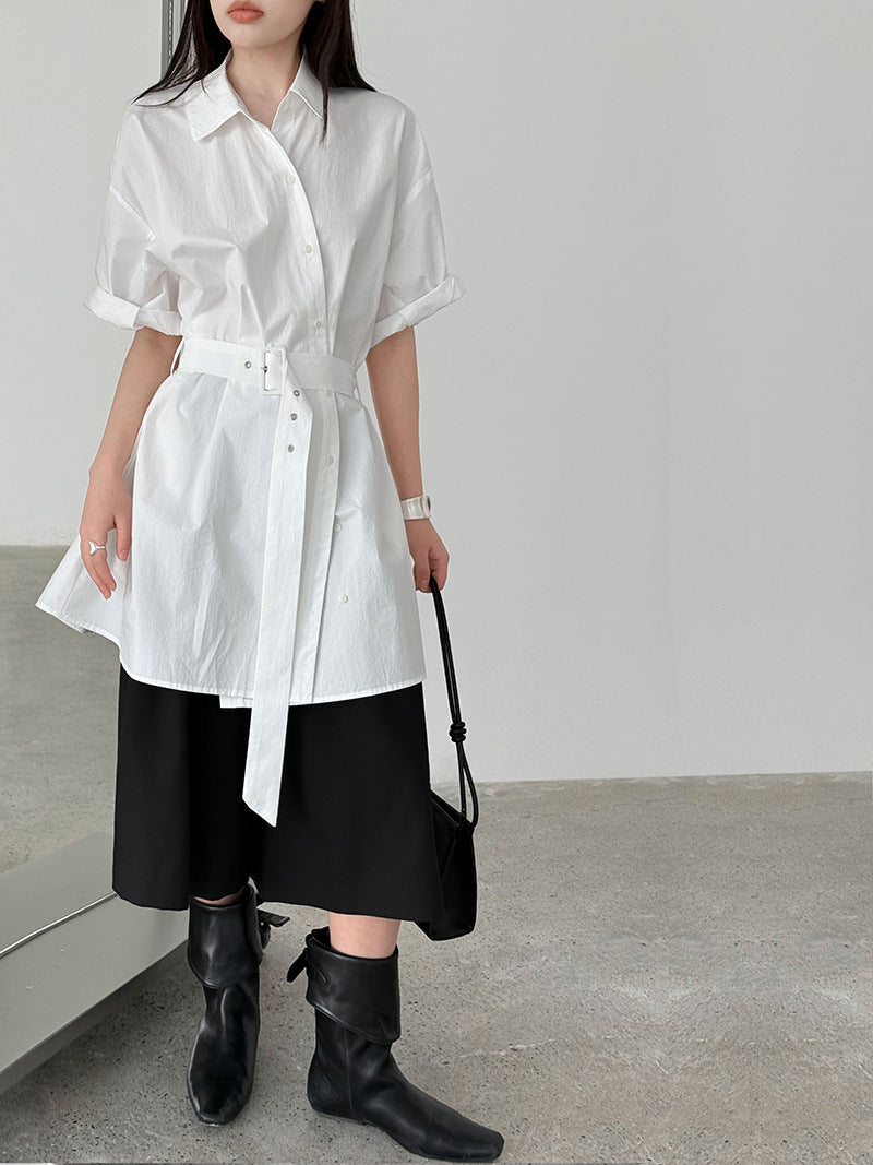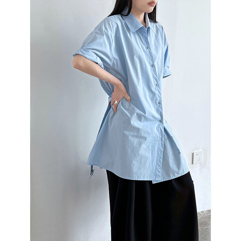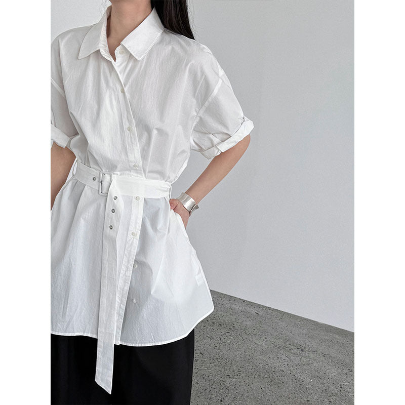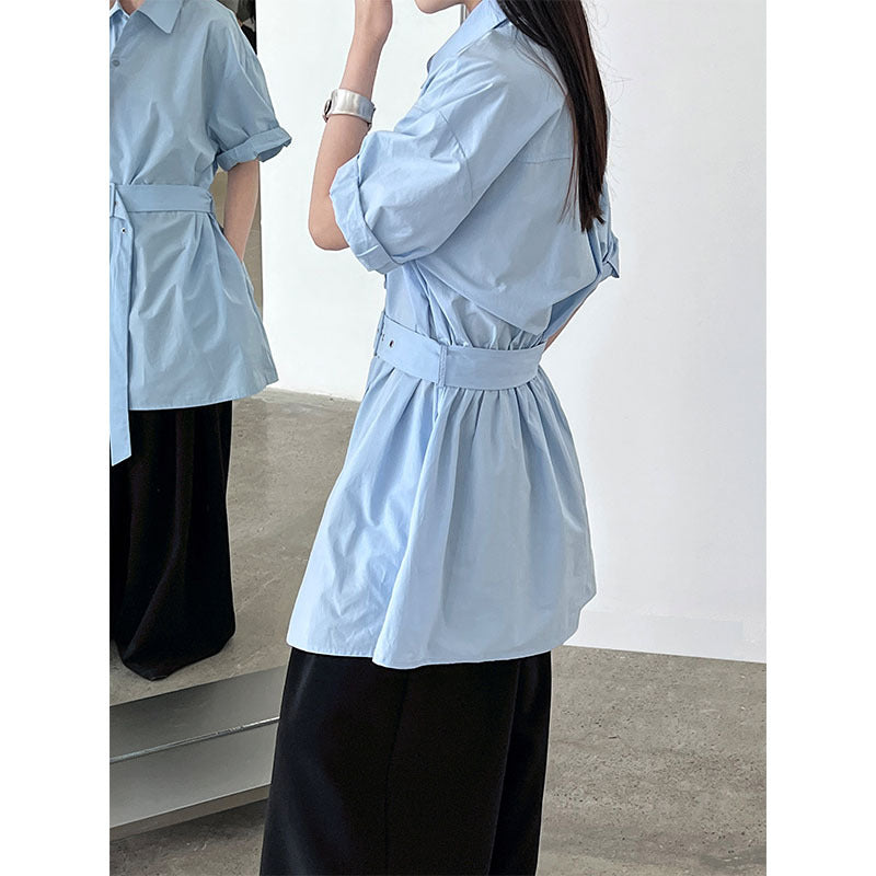 Luxi Korean niche design belt shirt women's summer new buckle loop strap waist short-sleeved top 8745