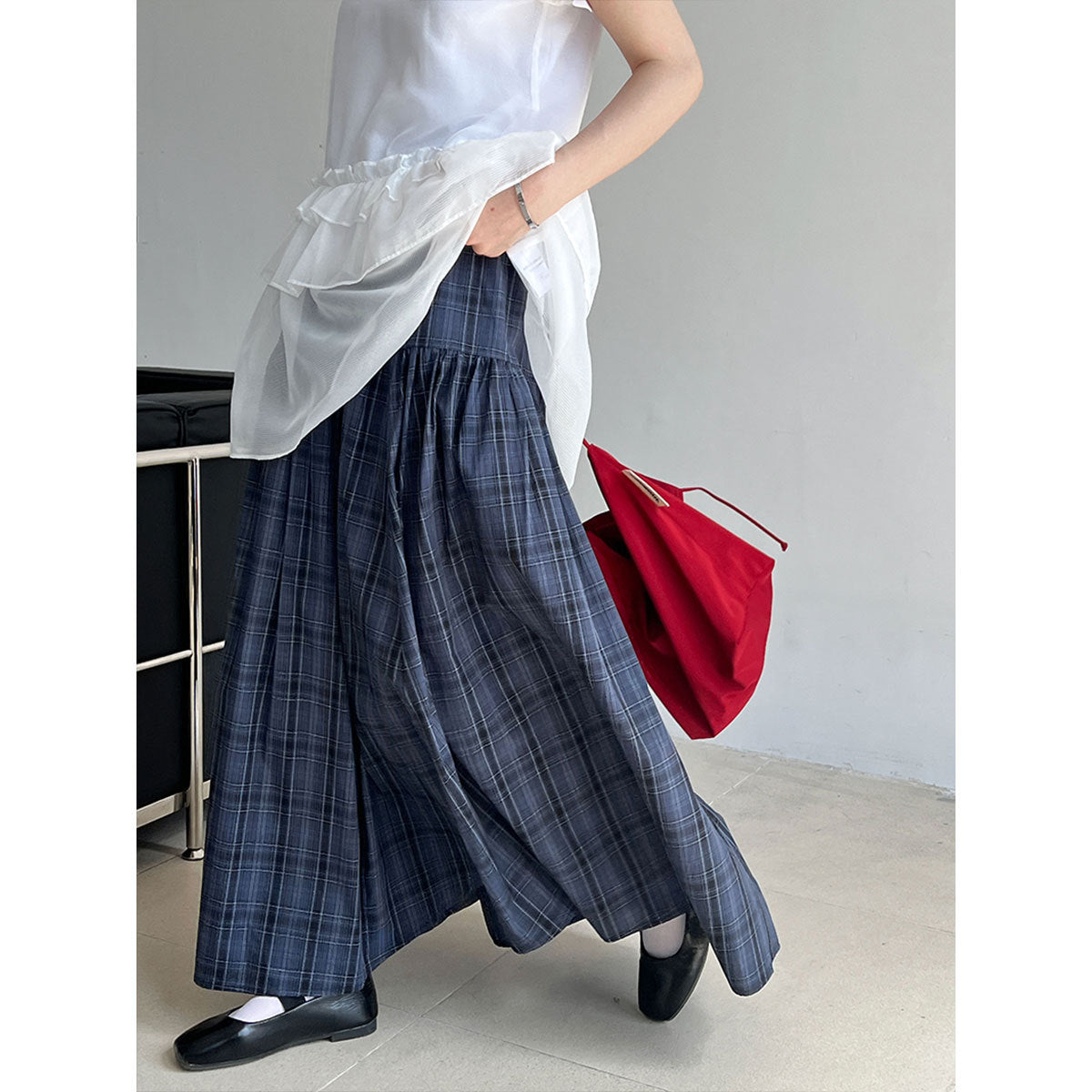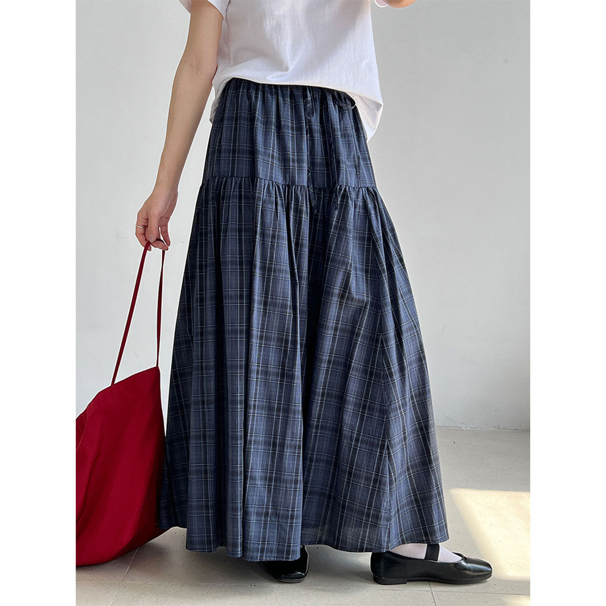 Luxi, plaid splicing skirt women's summer new elastic waist A-shaped skirt, large pendulum umbrella skirt, medium and long skirt 1875
