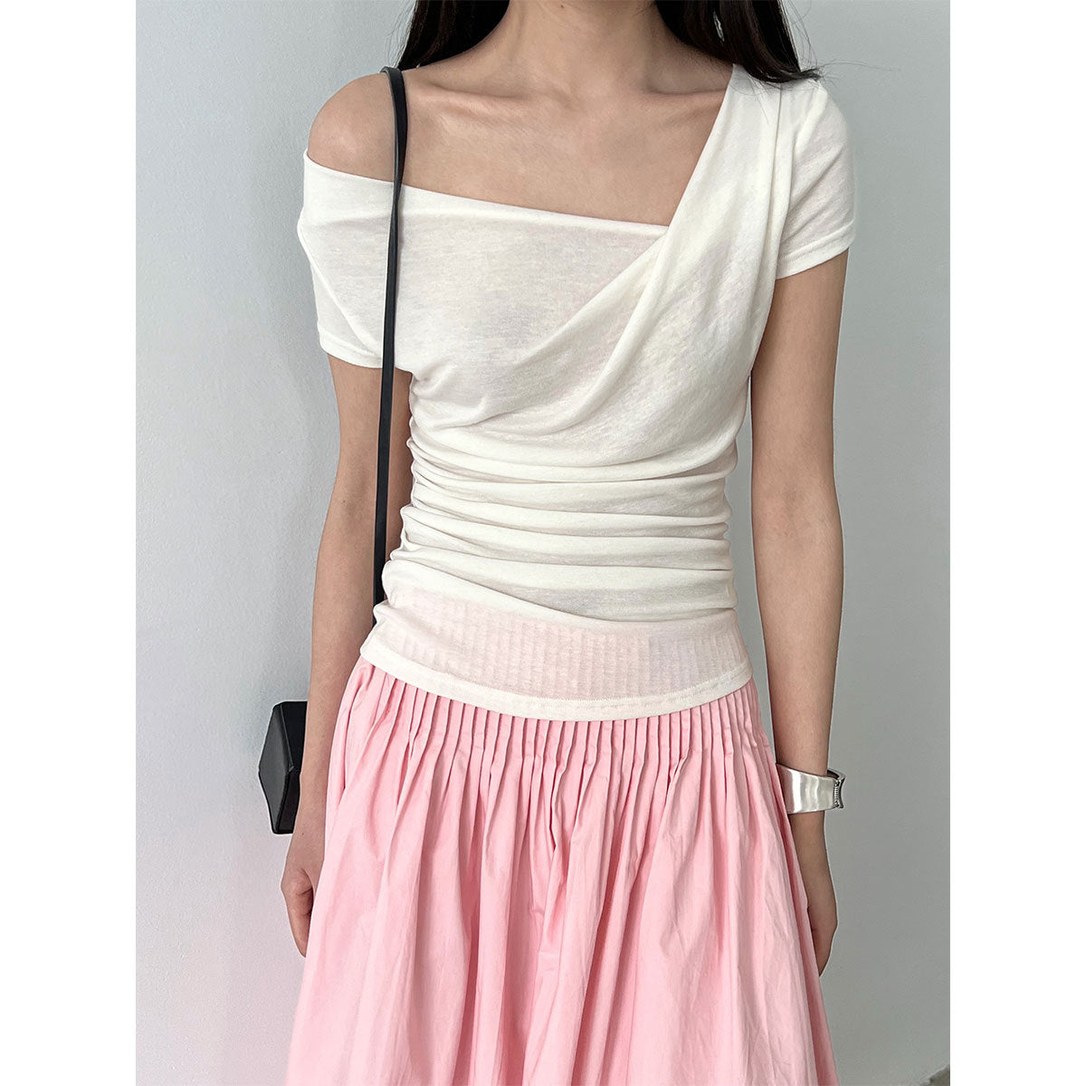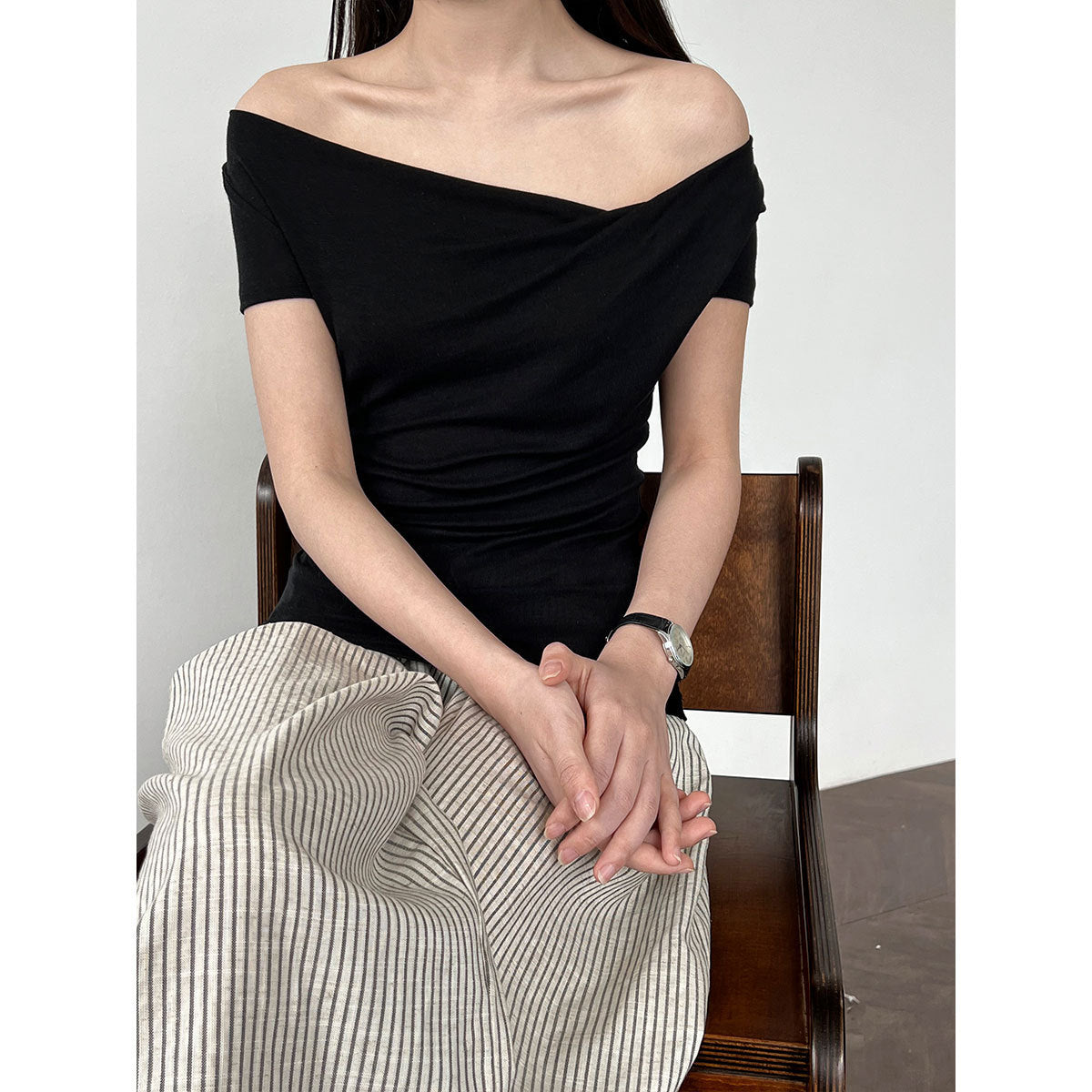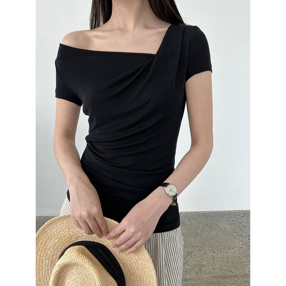 Luxi slanted shoulder swing neck short-sleeved T-shirt women's summer silk wool soft waxy light slim slim top 2699