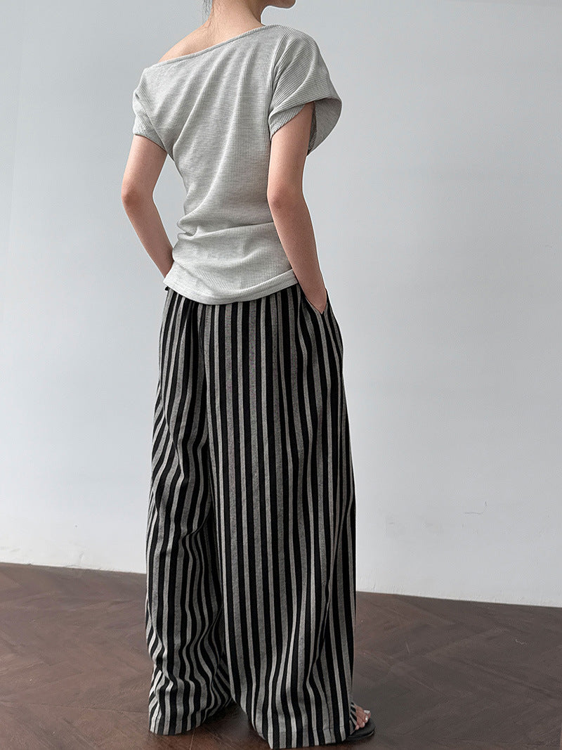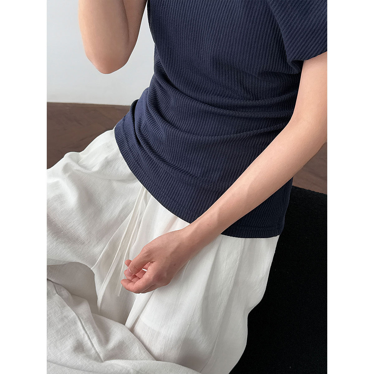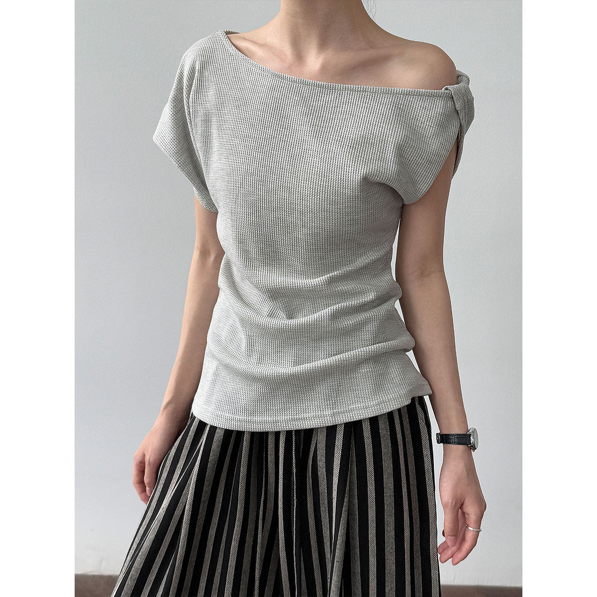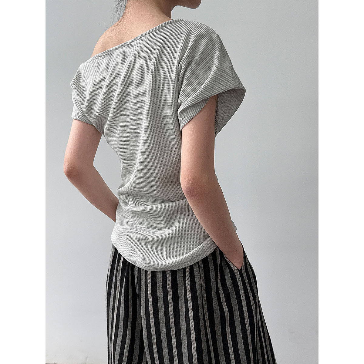 Luxi, waffle asymmetrical slanted shoulder kink T-shirt women's summer new slim and thin Spice Girl top thin 2703