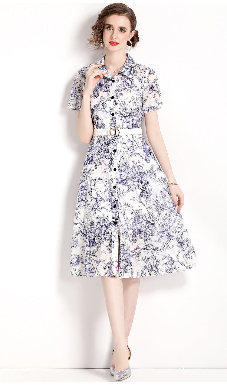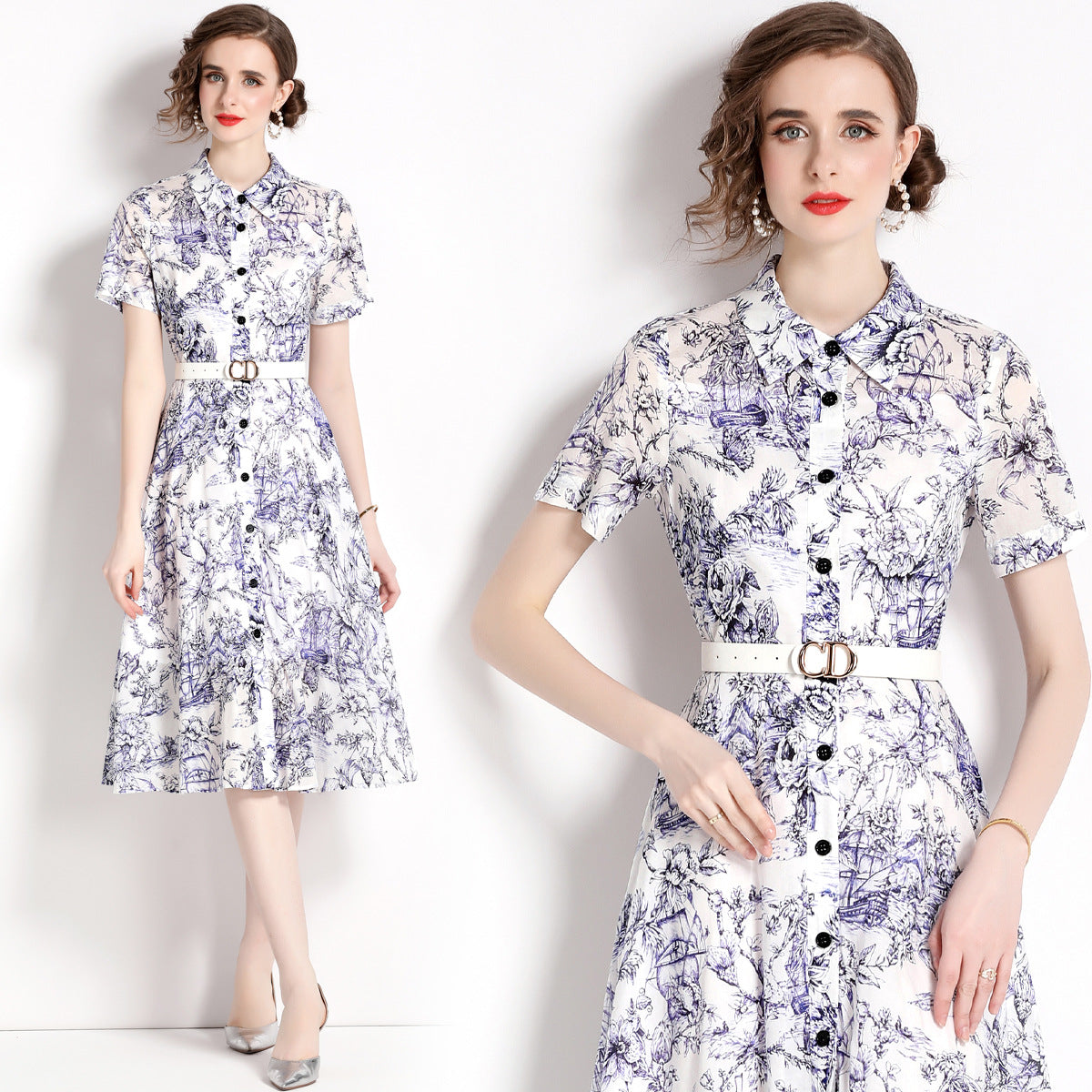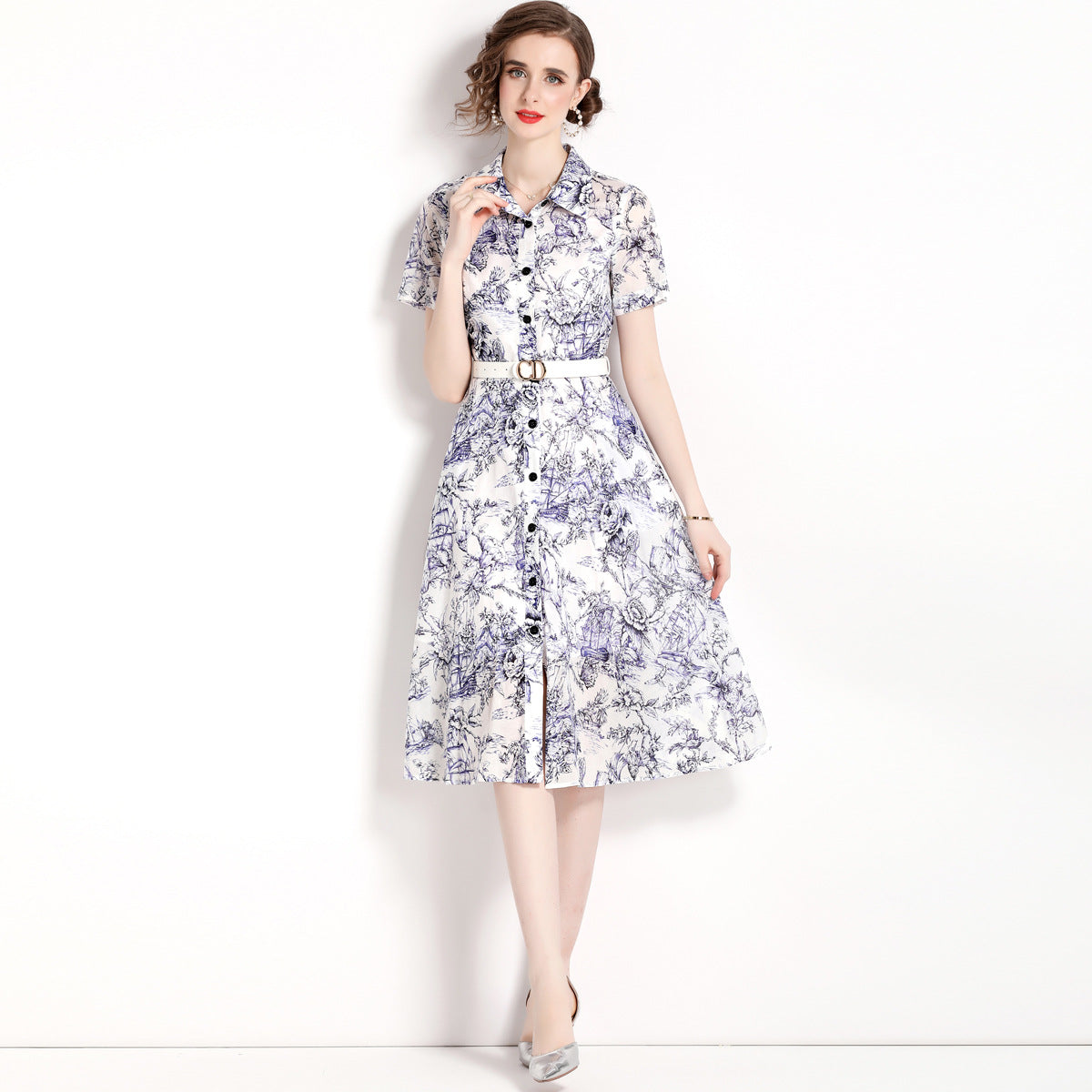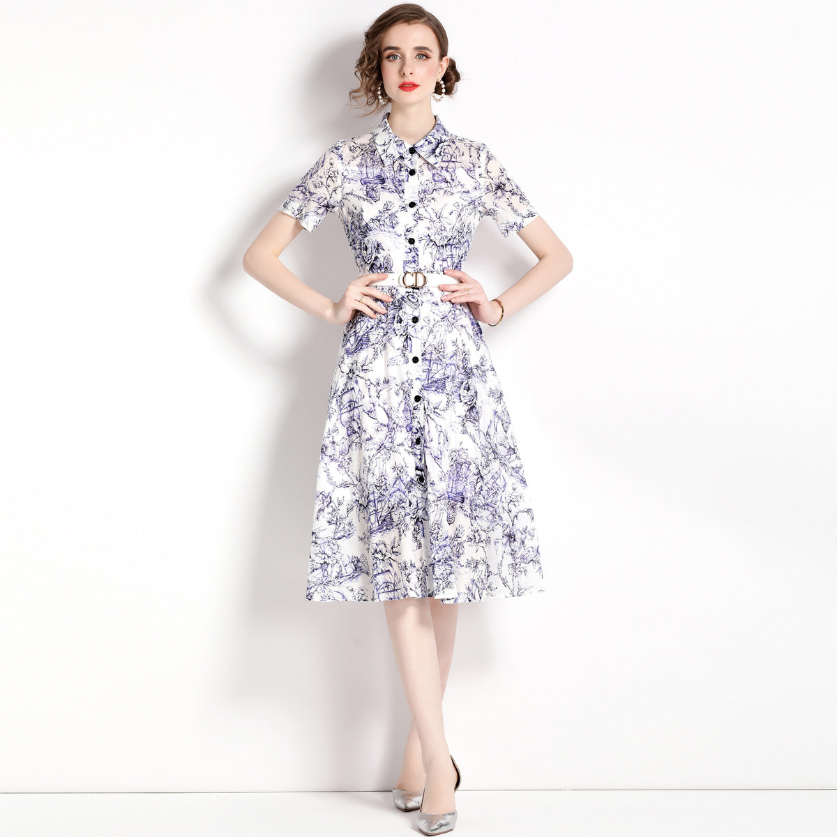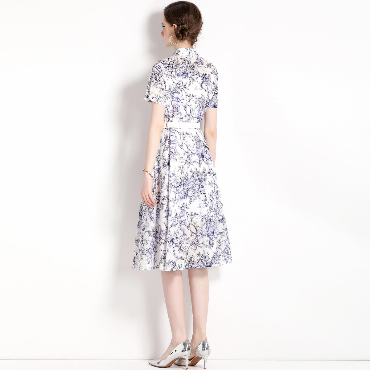 Medium and long shirt shirt skirt women's popular summer new retro lapel single-breasted printed lace-up dress