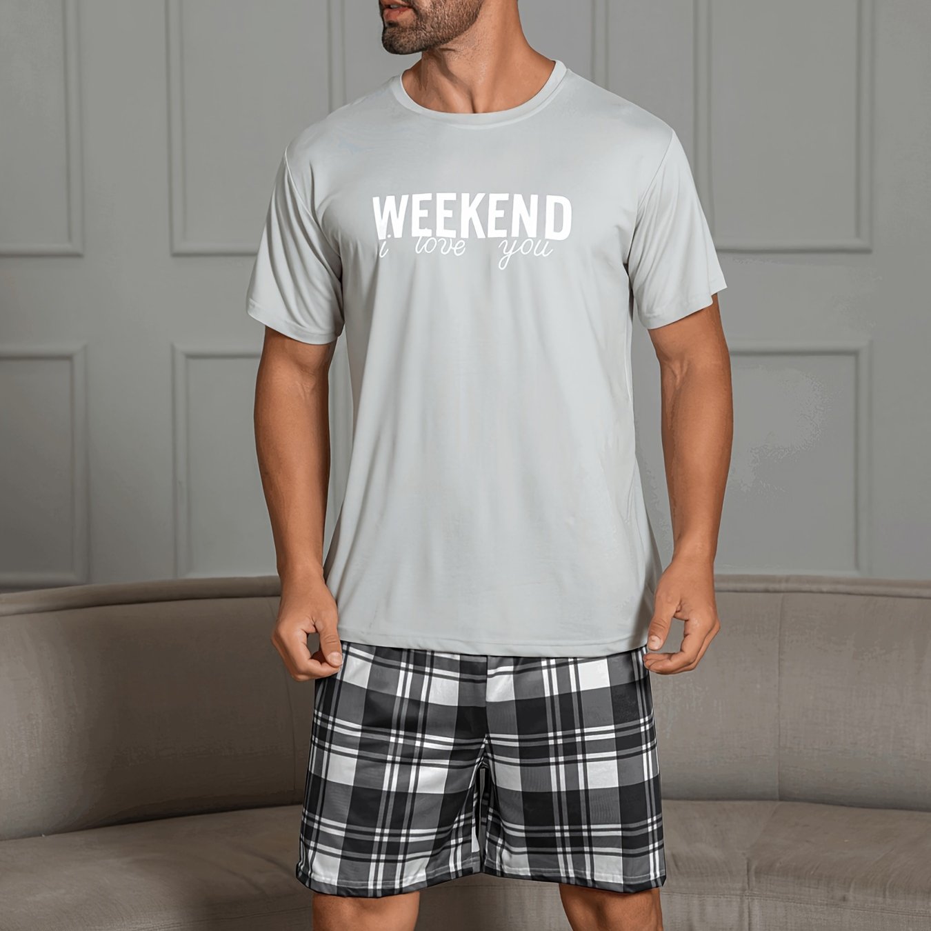 Mens Pajama Set - Relaxed Casual Style with Unique Grey Letter Print and Plaid Shorts, Ultra-Soft and Comfortable for Home and Outdoor Wearing, Perfect for Summer Season