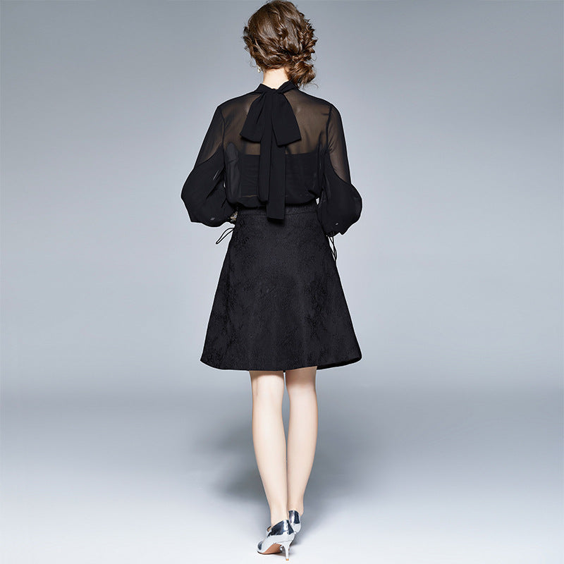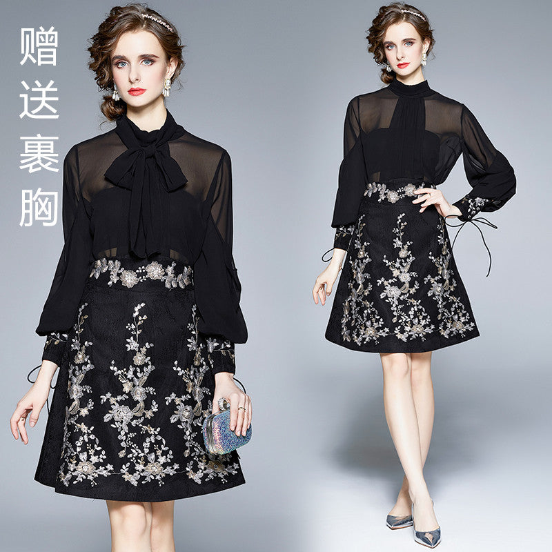 Muse Fan Heavy Industries Bow Stand-Up Collar Shirt Court Style Embroidery Sequins High Waist A-shaped Skirt Vintage Hong Kong Flavor Set