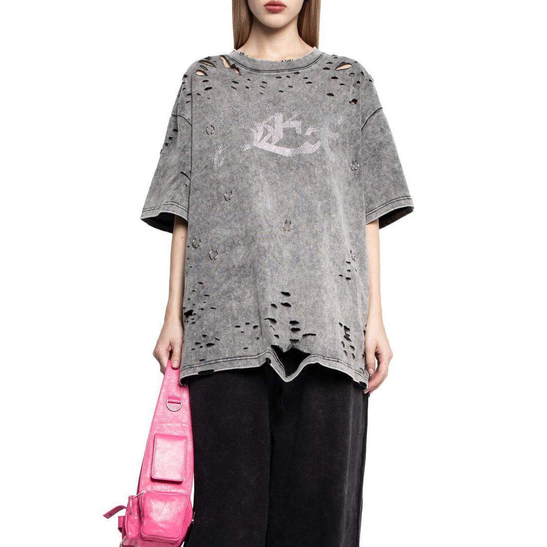 n new trendy high street round neck hot diamond washed old ripped T-shirt versatile short sleeve loose metal top