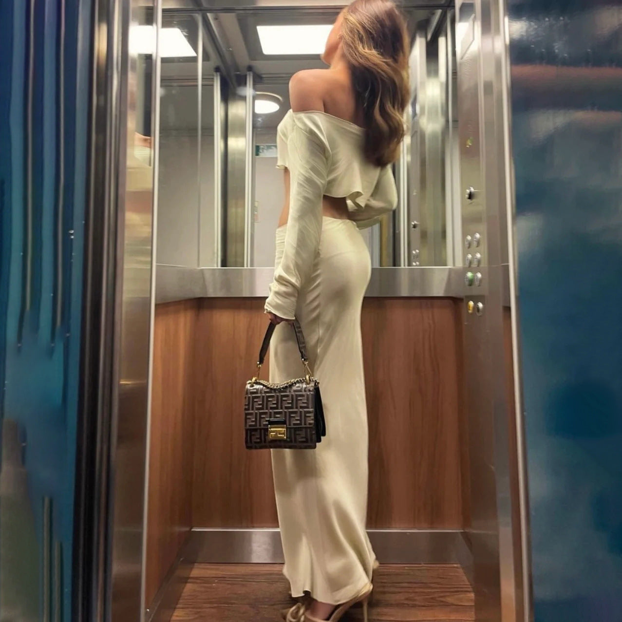 new fashion temperament elegant one-word shoulder long-sleeved top low-rise long skirt two-piece set waist sexy Popular trade