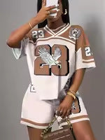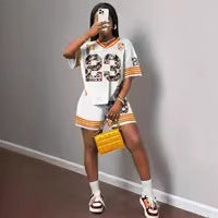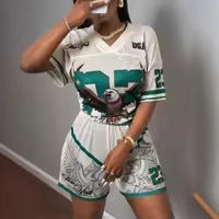 new New fashion retro street printing loose casual V-neck short-sleeved top shorts sports suit