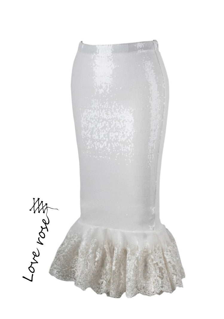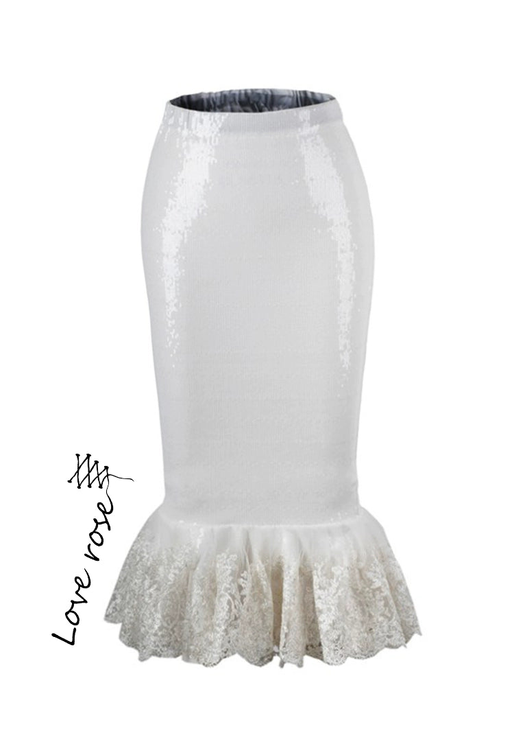 original design, white sequined hip-wrapped fishtail skirt, retro tight skirt with ruffle edge