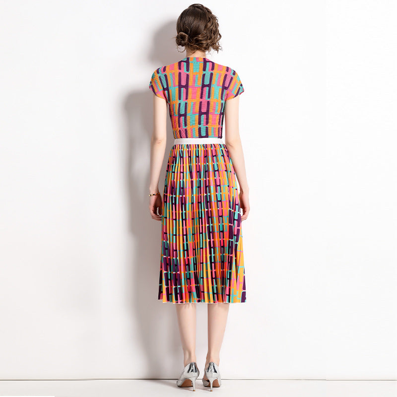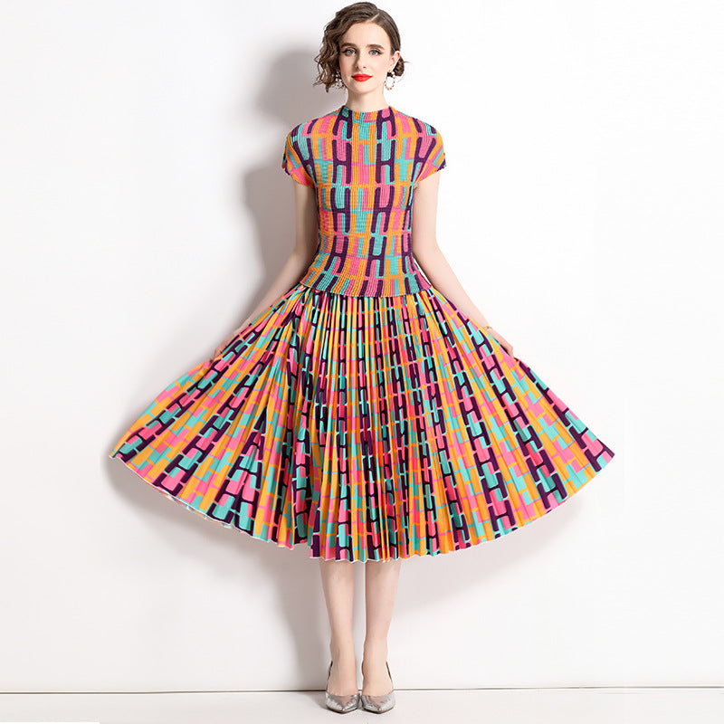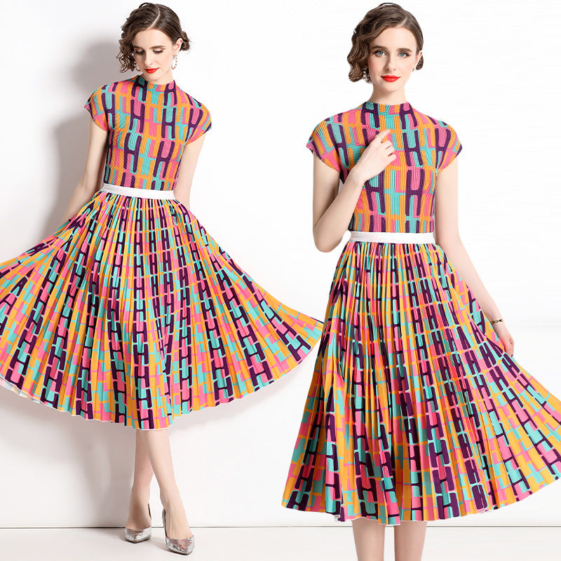 Pleated summer dress Popular style printed top set fashionable and thin skirt two-piece set chiffon wear