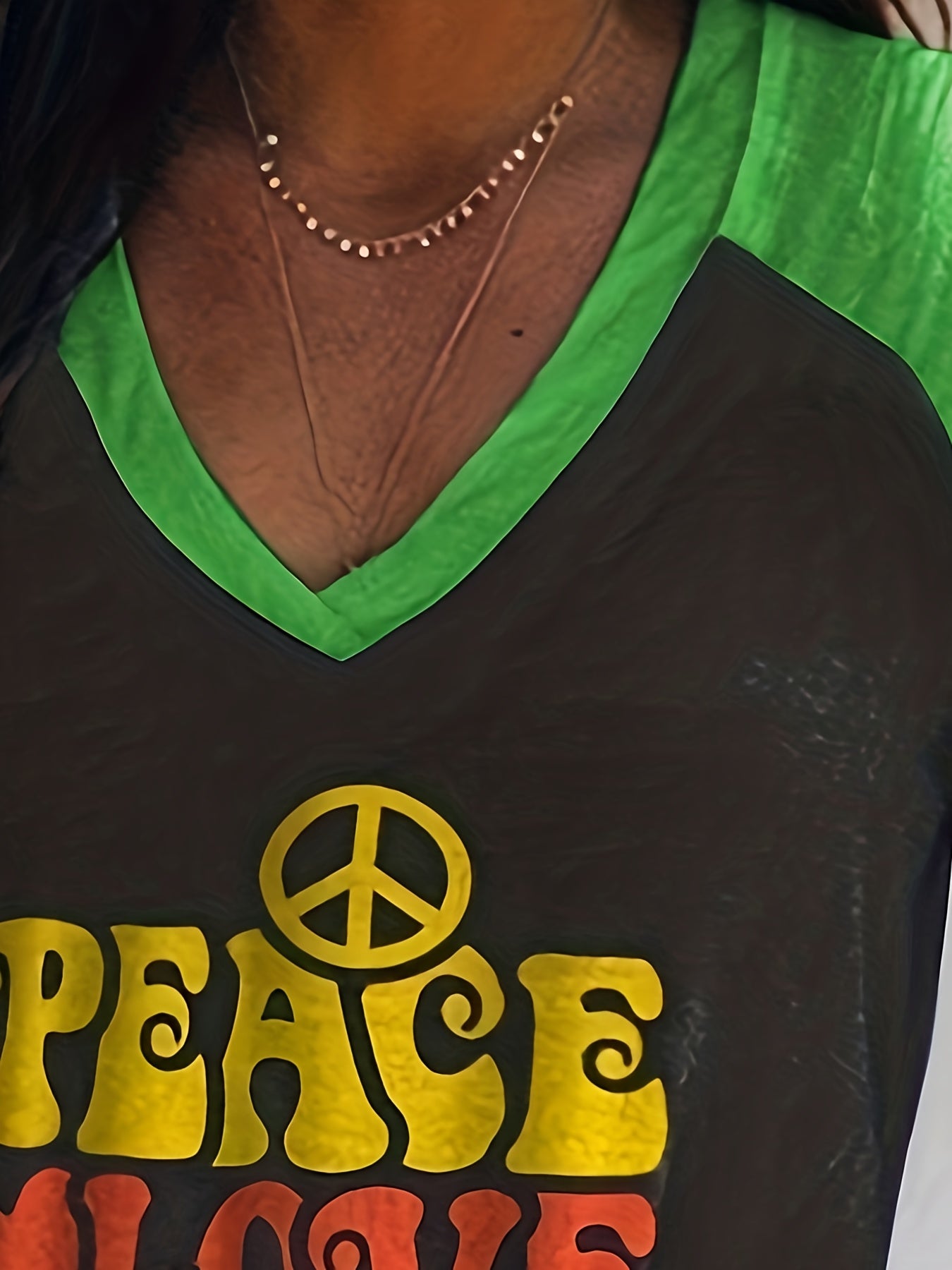 Plus Size Casual T-shirt, Women's Plus Colorblock Letter & Guitar Print Long Sleeve V Neck Slight Stretch T-shirt