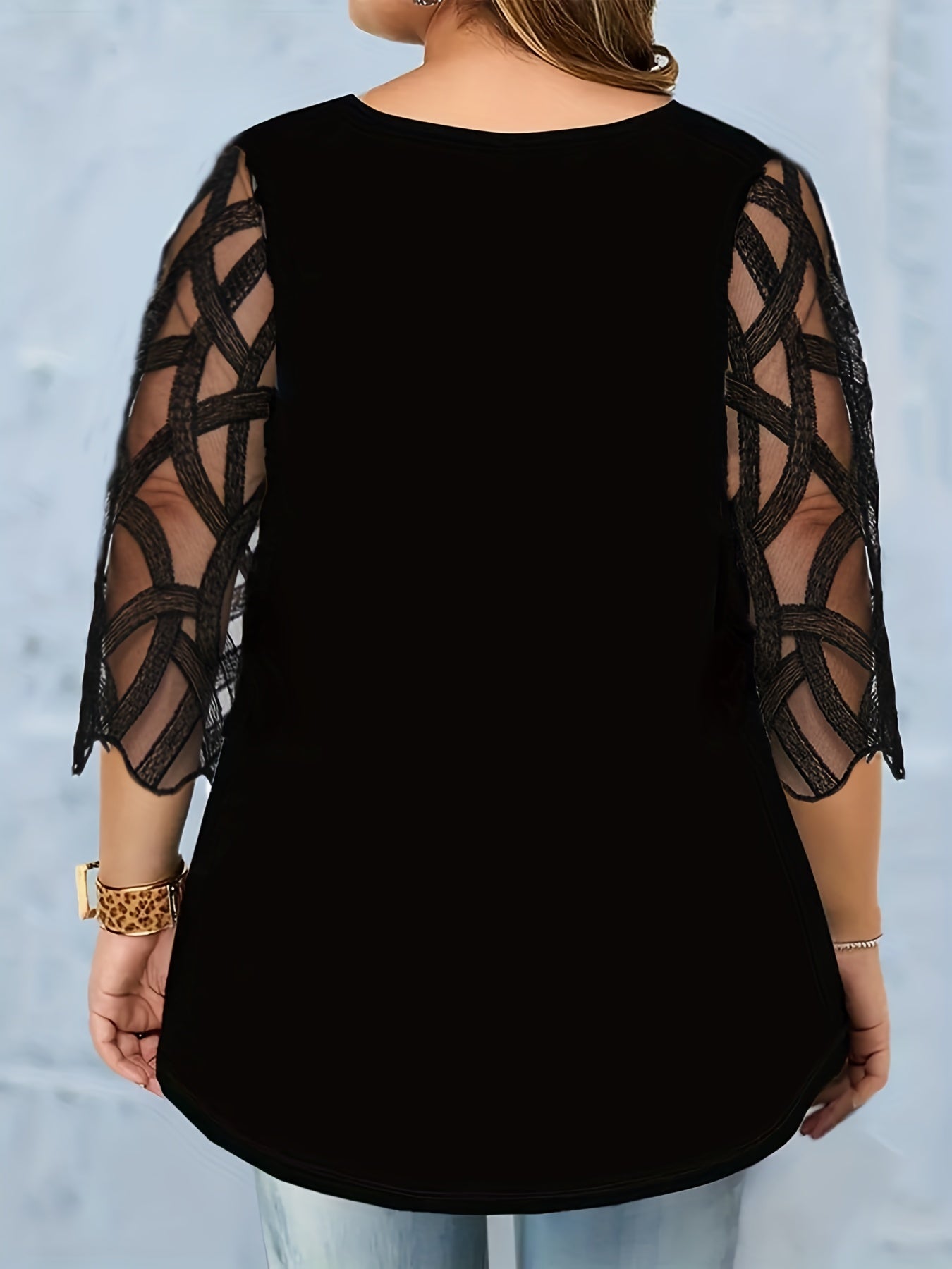 Plus Size Casual T-shirt, Women's Plus Glitter Butterfly Print Contrast Lace Half Sleeve Round Neck Slight Stretch T-shirt