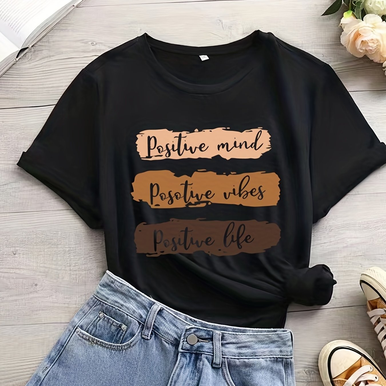 Plus Size Casual T-shirt, Women's Plus Letter Print Short Sleeve Round Neck Slight Stretch T-shirt
