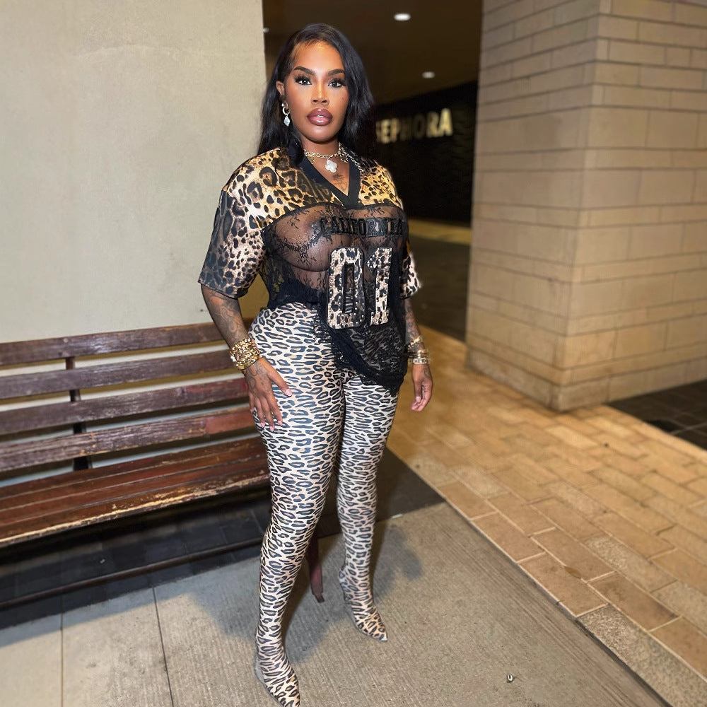 popular New fashion printing retro V-neck short-sleeved lace leopard print splicing top loose casual T-shirt women