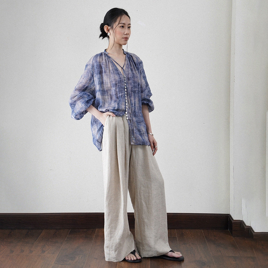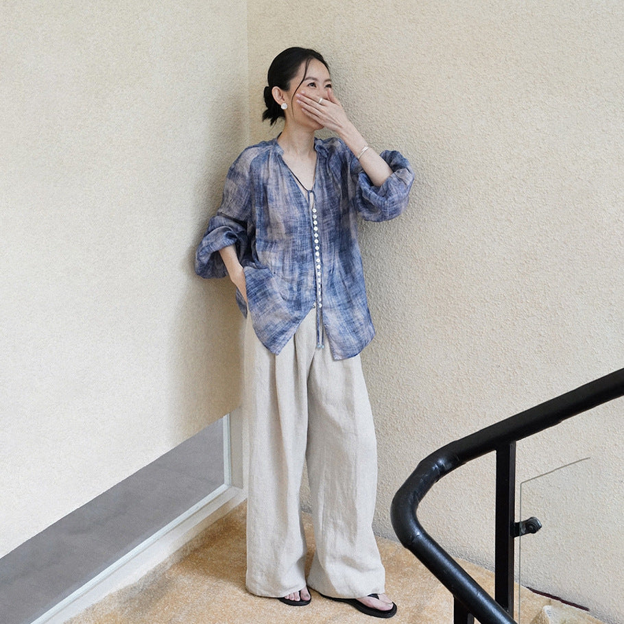 Ramie top high-end, summer ink smudge sunscreen Ramie shirt, thin linen wide-leg pants A0312