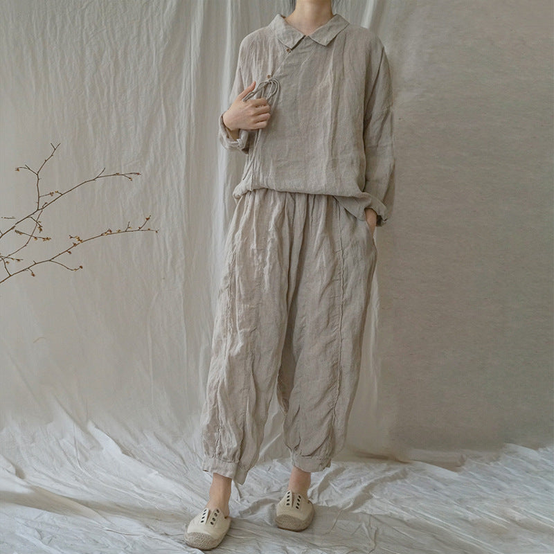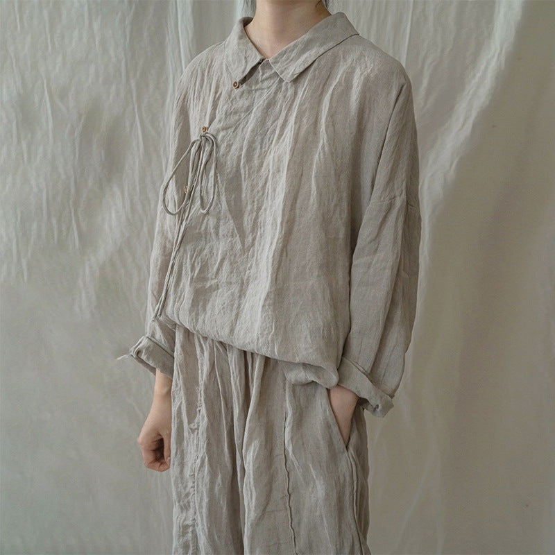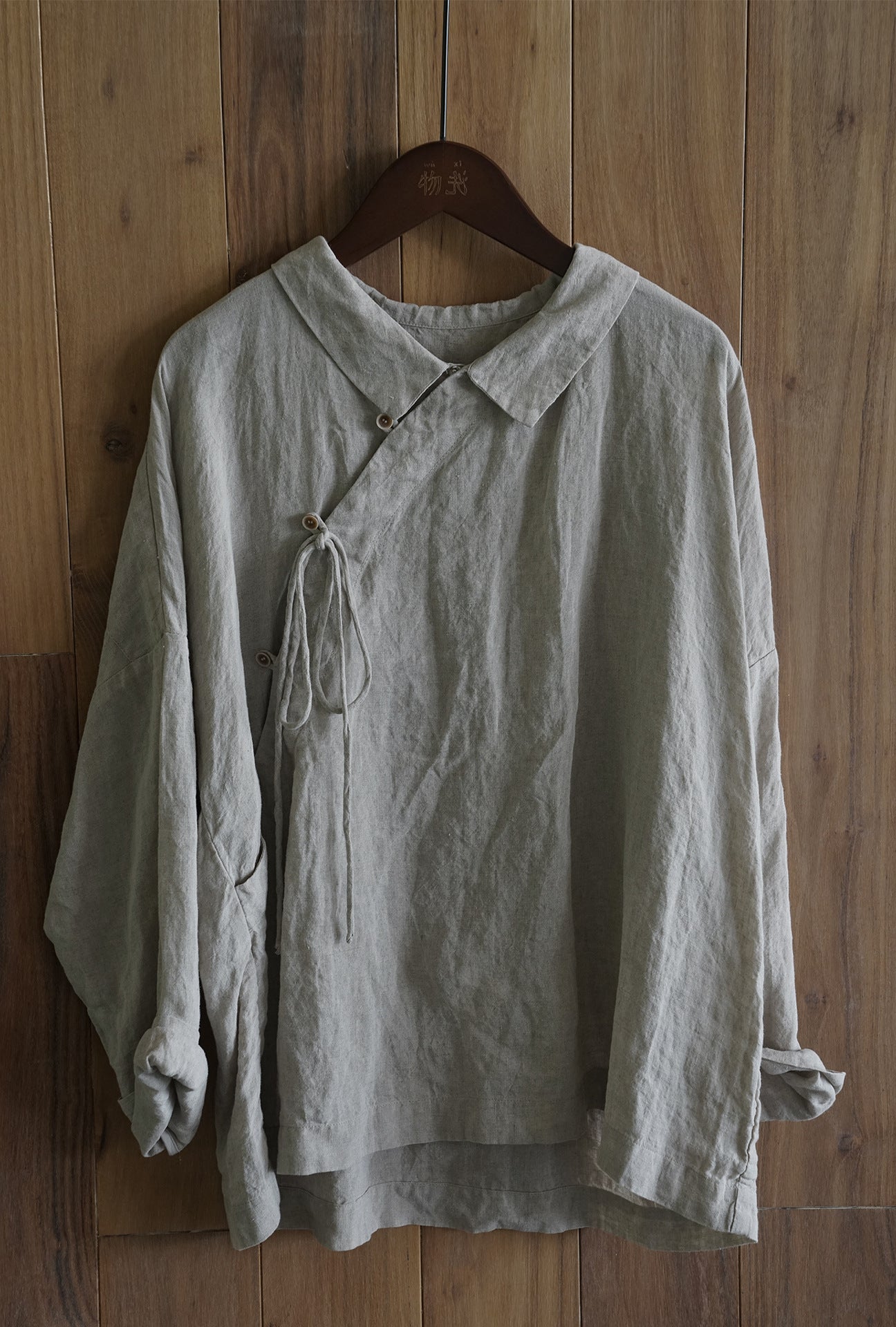 retro literary lapel slanted rain and dew hemp shirt, casual light Chinese natural hemp top S22262
