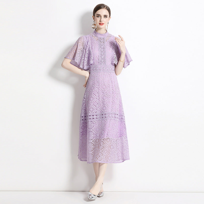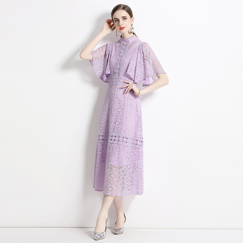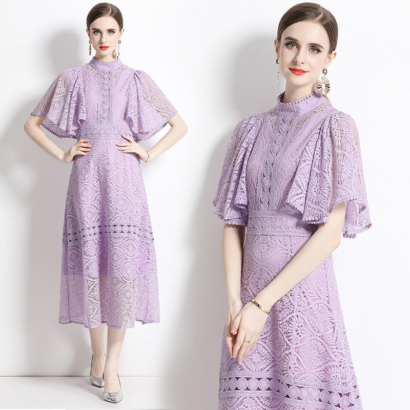 summer new stand-up collar flying sleeves temperament waist thin lace banquet dress long skirt a-word skirt