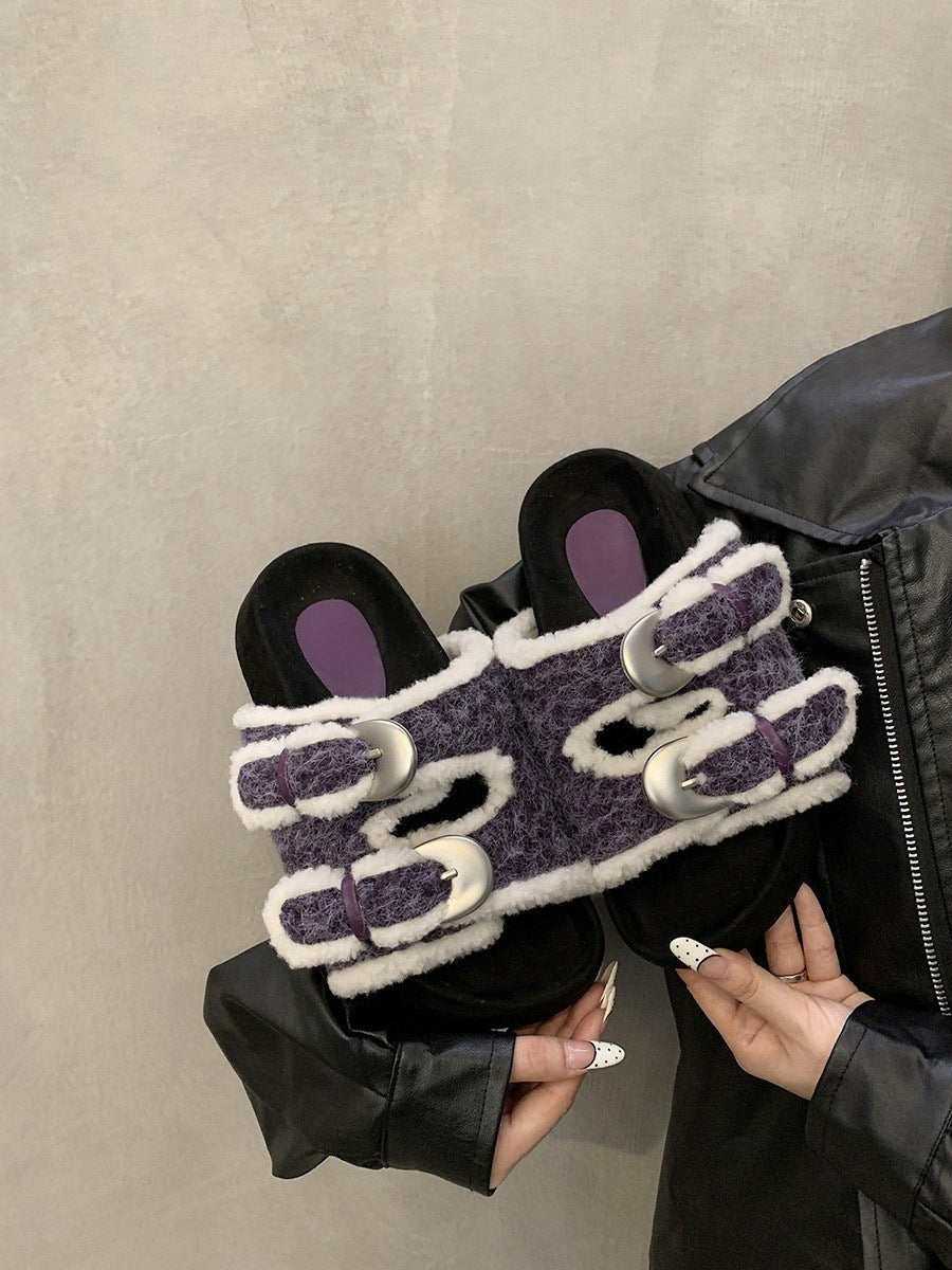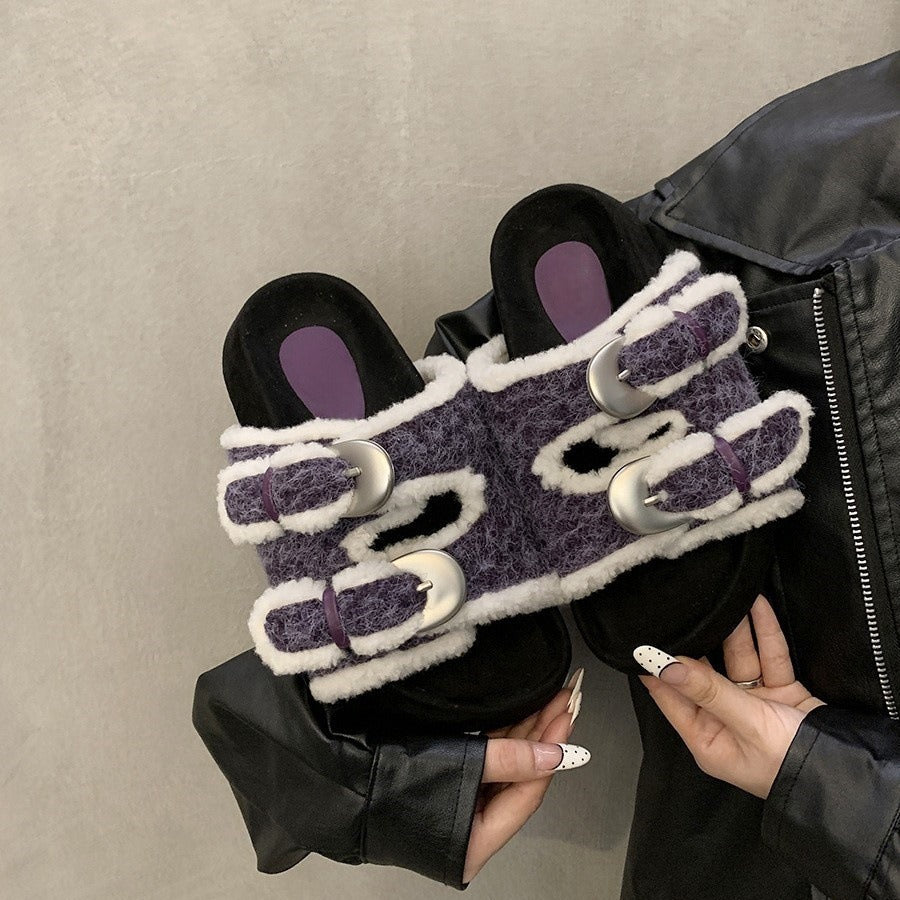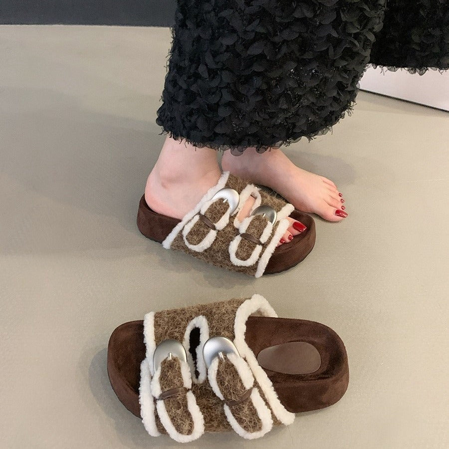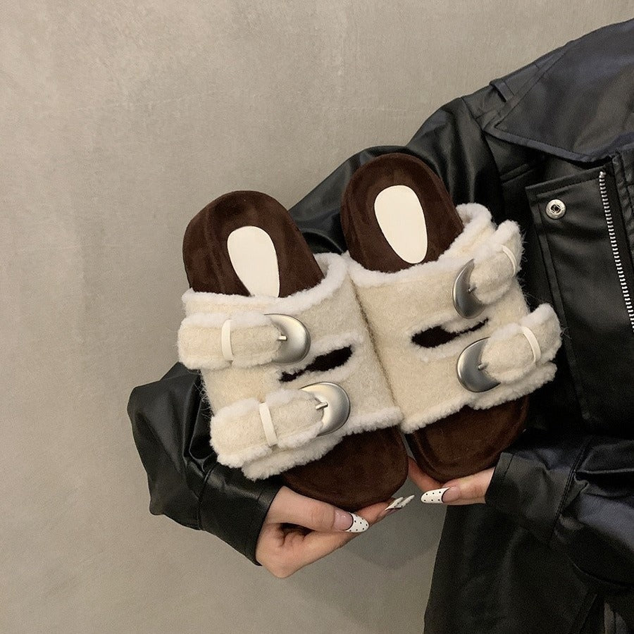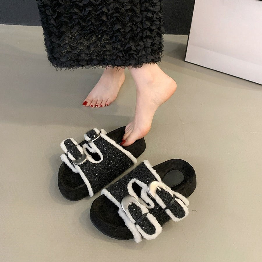Thick-soled fluffy shoes for women to wear outside popular new autumn and winter gentle fairy buckles to increase the height of one pedal and cotton slippers