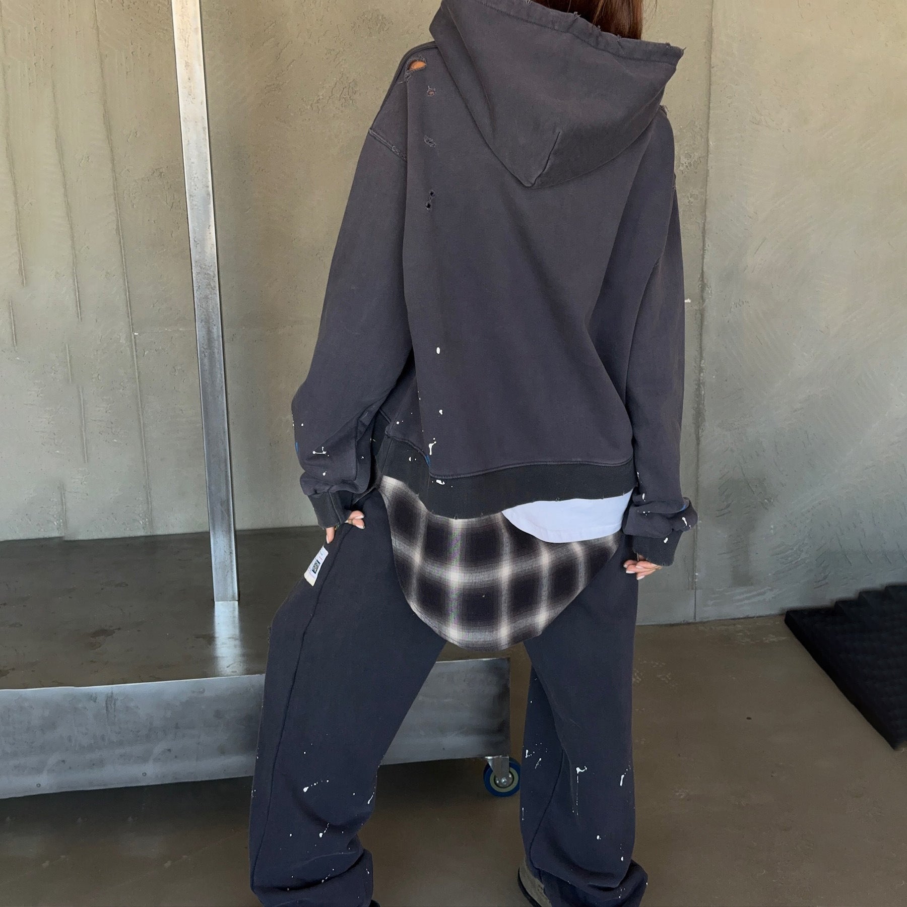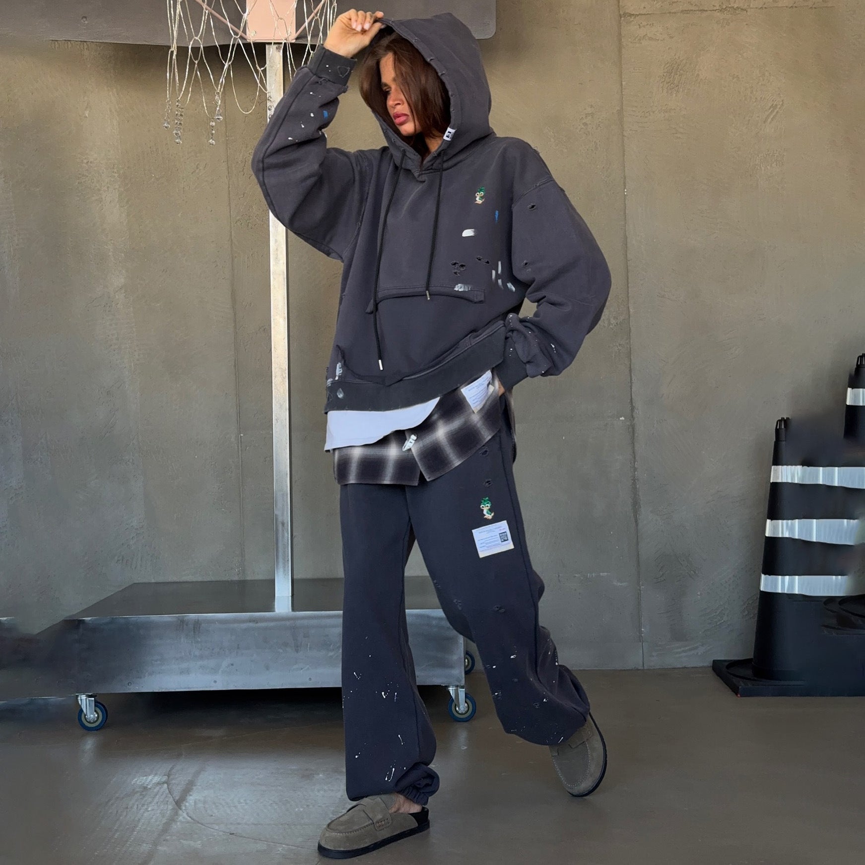 trendy brand stacking sweater splicing shirt set women's high-end sense hole paint hooded set Popular trade