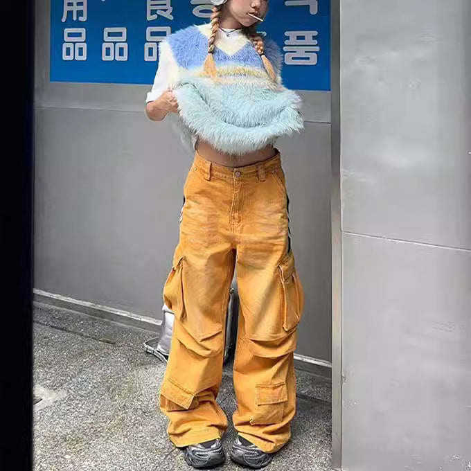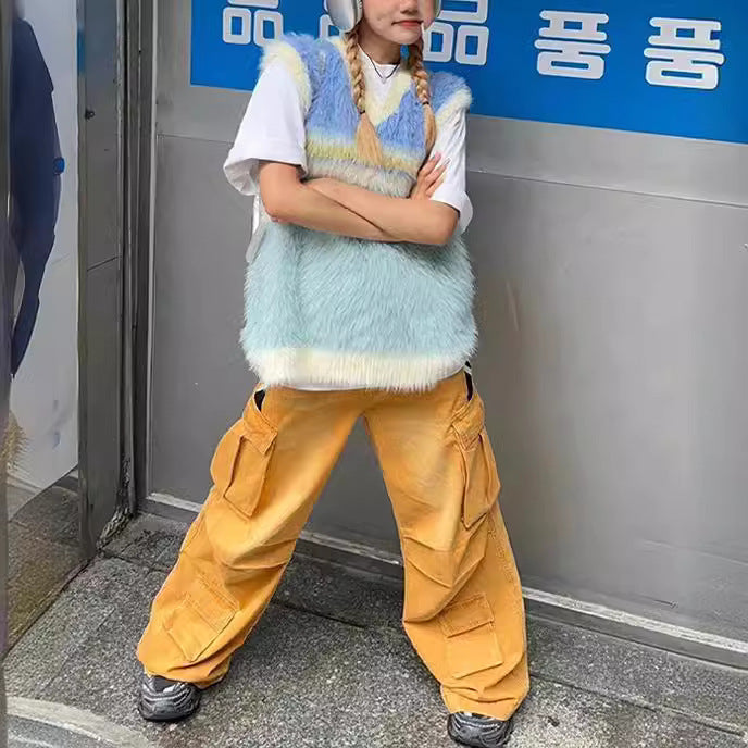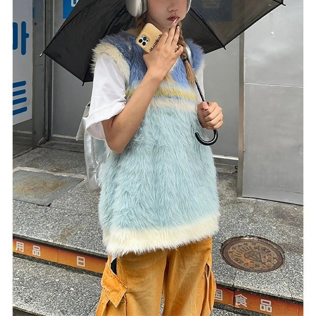 VLOVELAW American hiphop knitted sweater women's spring and autumn contrasting color v-neck vest jacket couple loose sleeveless vest top