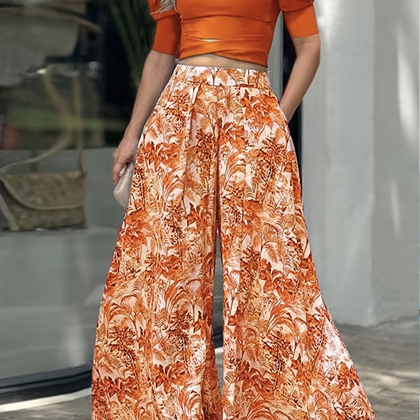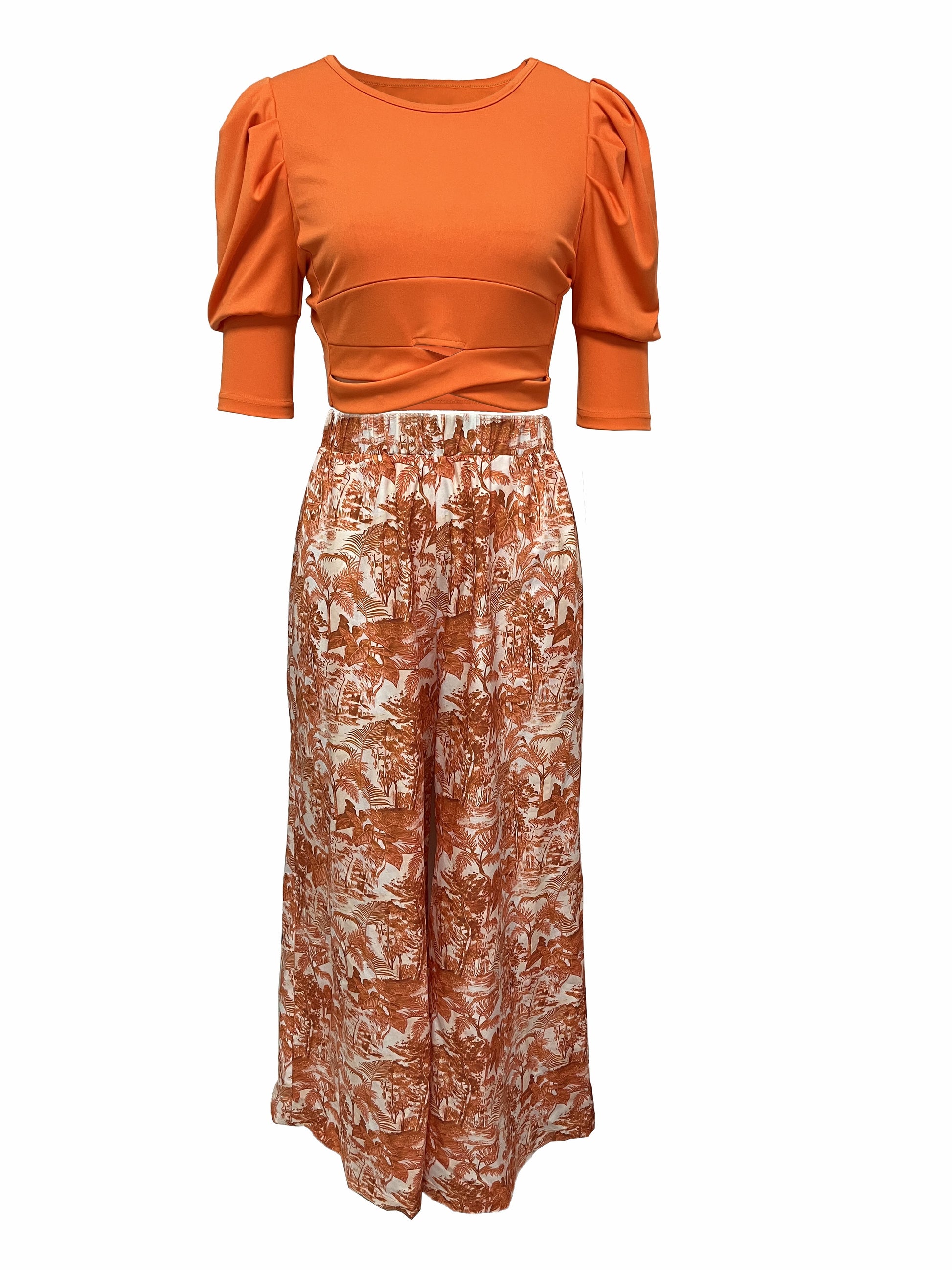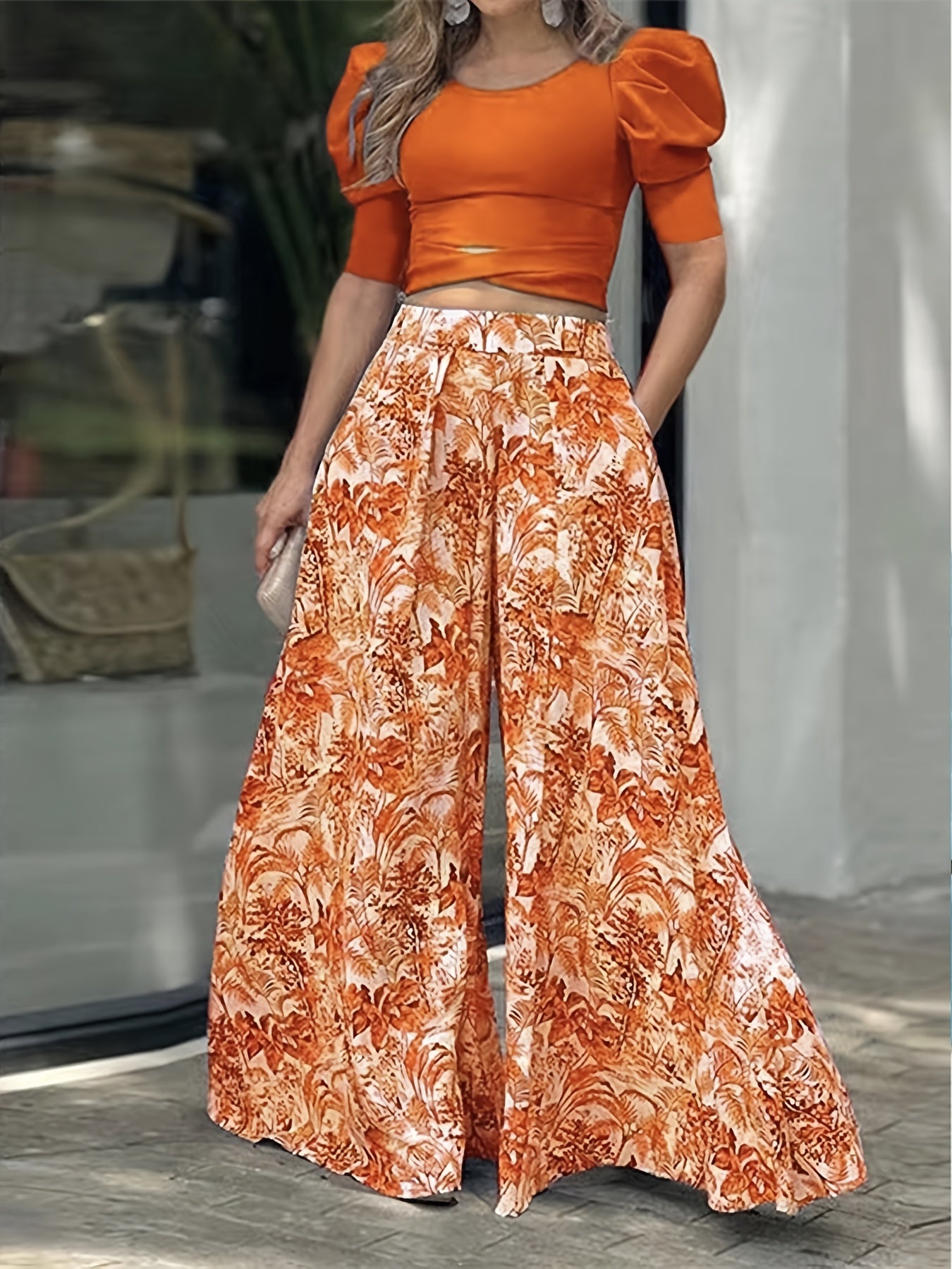 vlovelaw Casual Spring & Fall Two-piece Set, Solid Puff Sleeve Tops & Floral Print Palazzo Pants Outfits, Women's Clothing