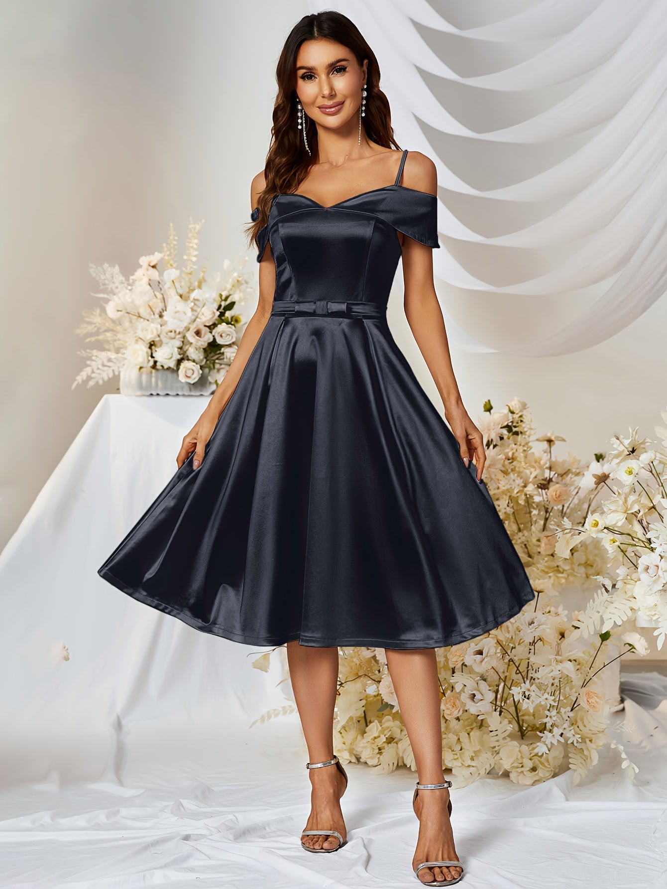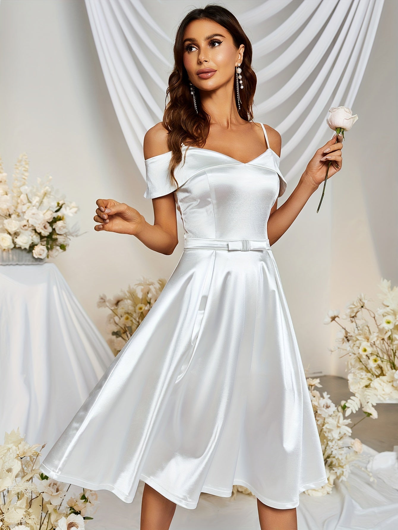 vlovelaw Cold Shoulder V Neck Dress, Elegant Strap Flare Dress For Party & Banquet, Women's Clothing