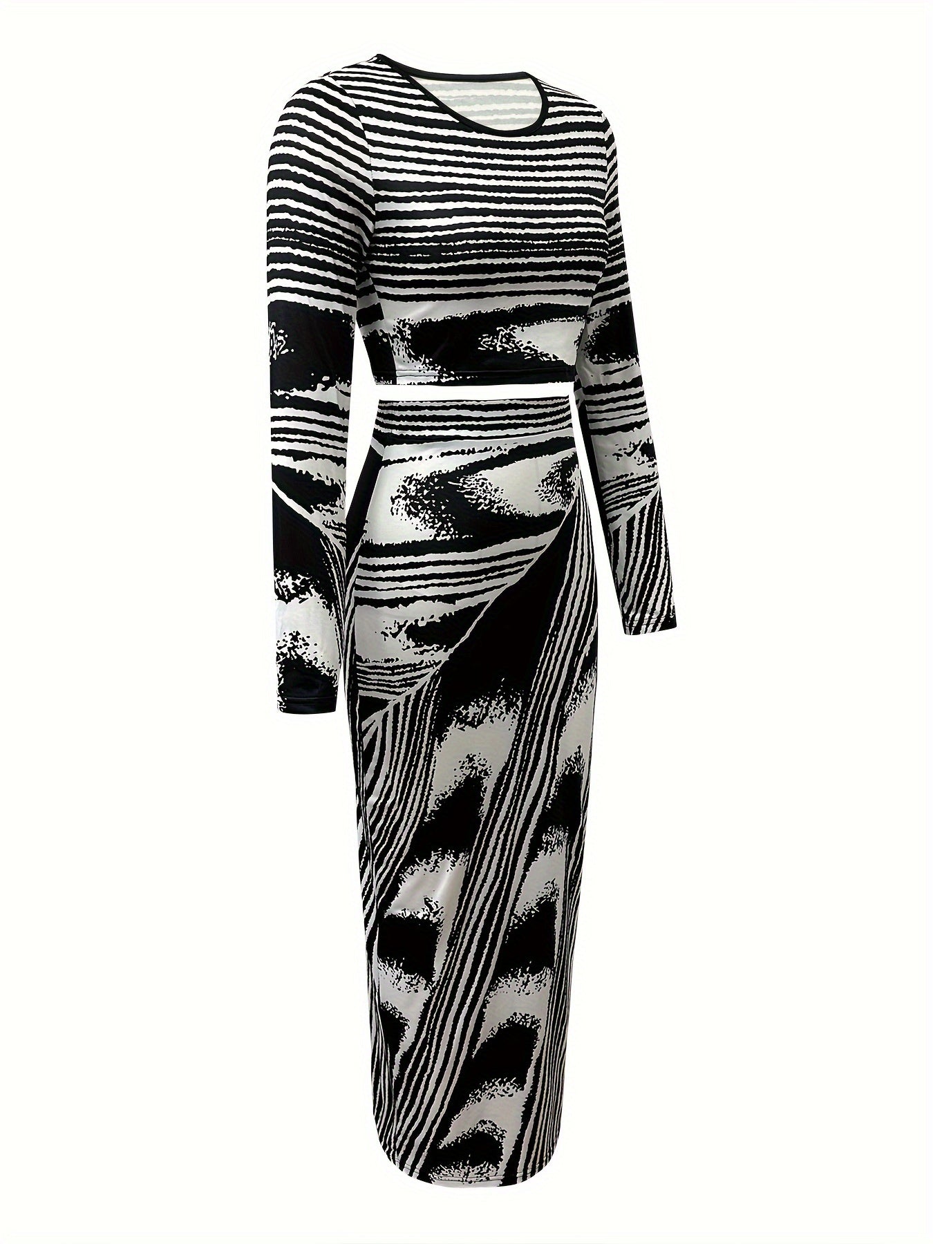 vlovelaw Color Block Two-piece Set, Long Sleeve Crew Neck Crop Top & Ankle Length Slim Skirt Outfits, Women's Clothing
