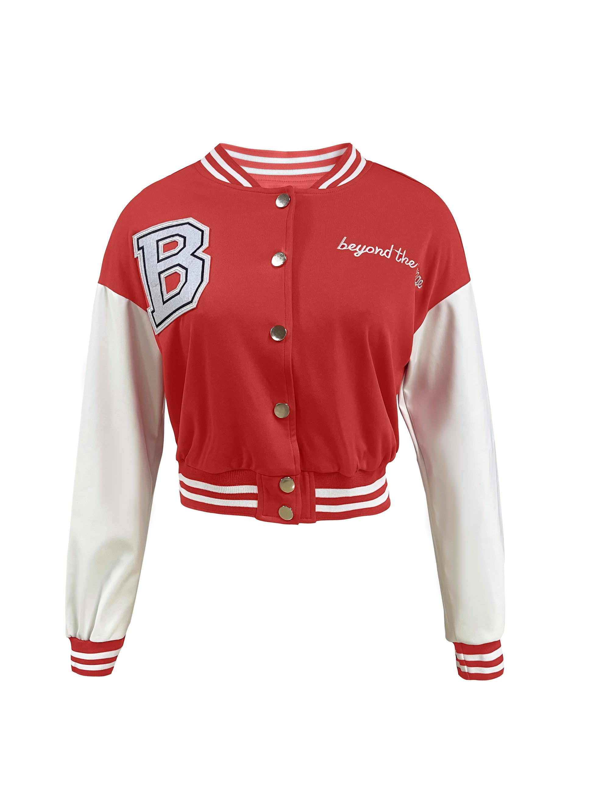 vlovelaw Contrast Faux Leather Letter Print Crop Jacket, Casual Button Up Bomber Jacket For Spring & Fall, Women's Clothing