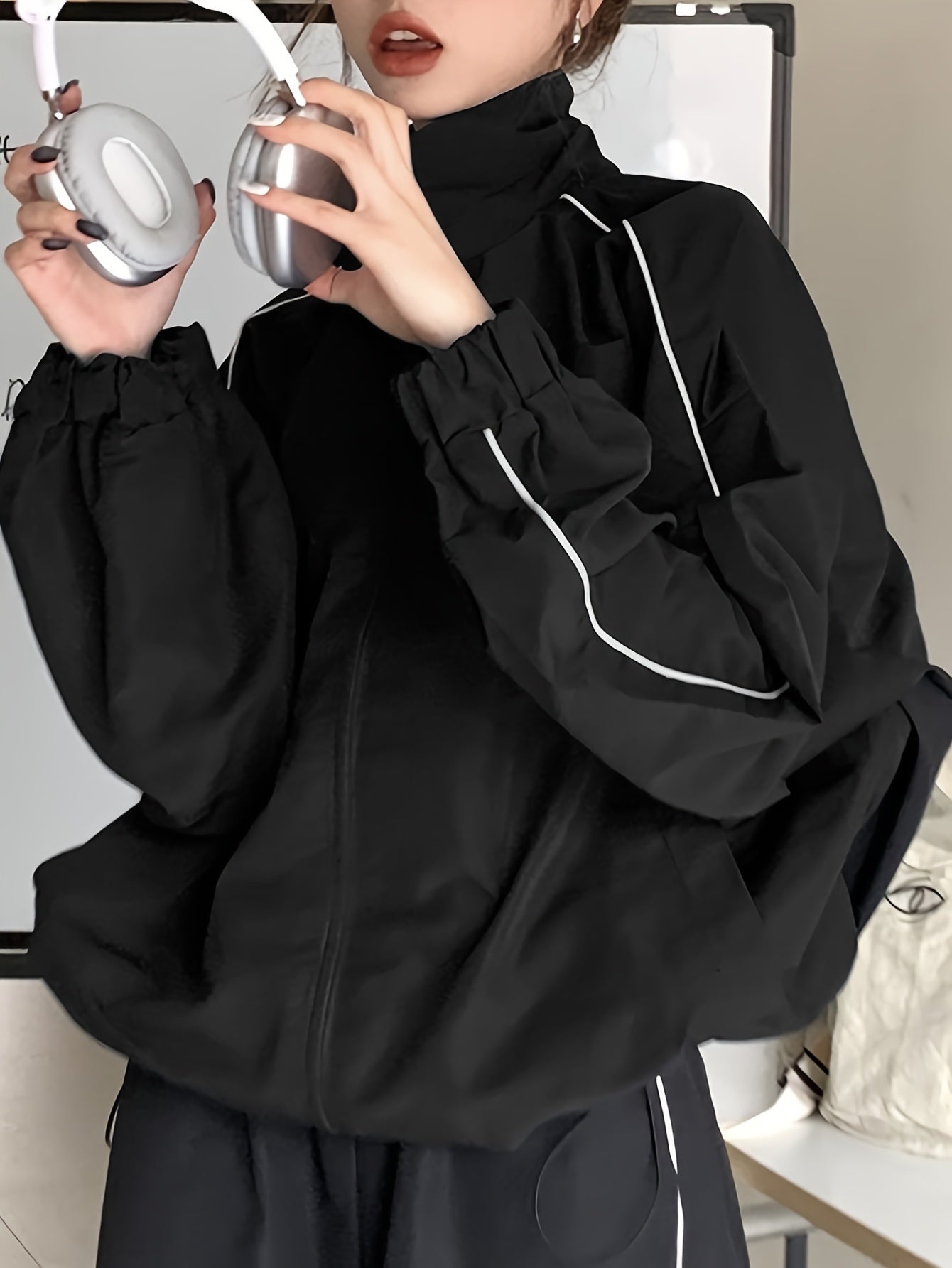 vlovelaw Contrast Trim Loose Open Front Jacket, Casual Lapel Neck Zipper Drawstring Long Sleeve Jacket For Spring & Fall, Women's Clothing