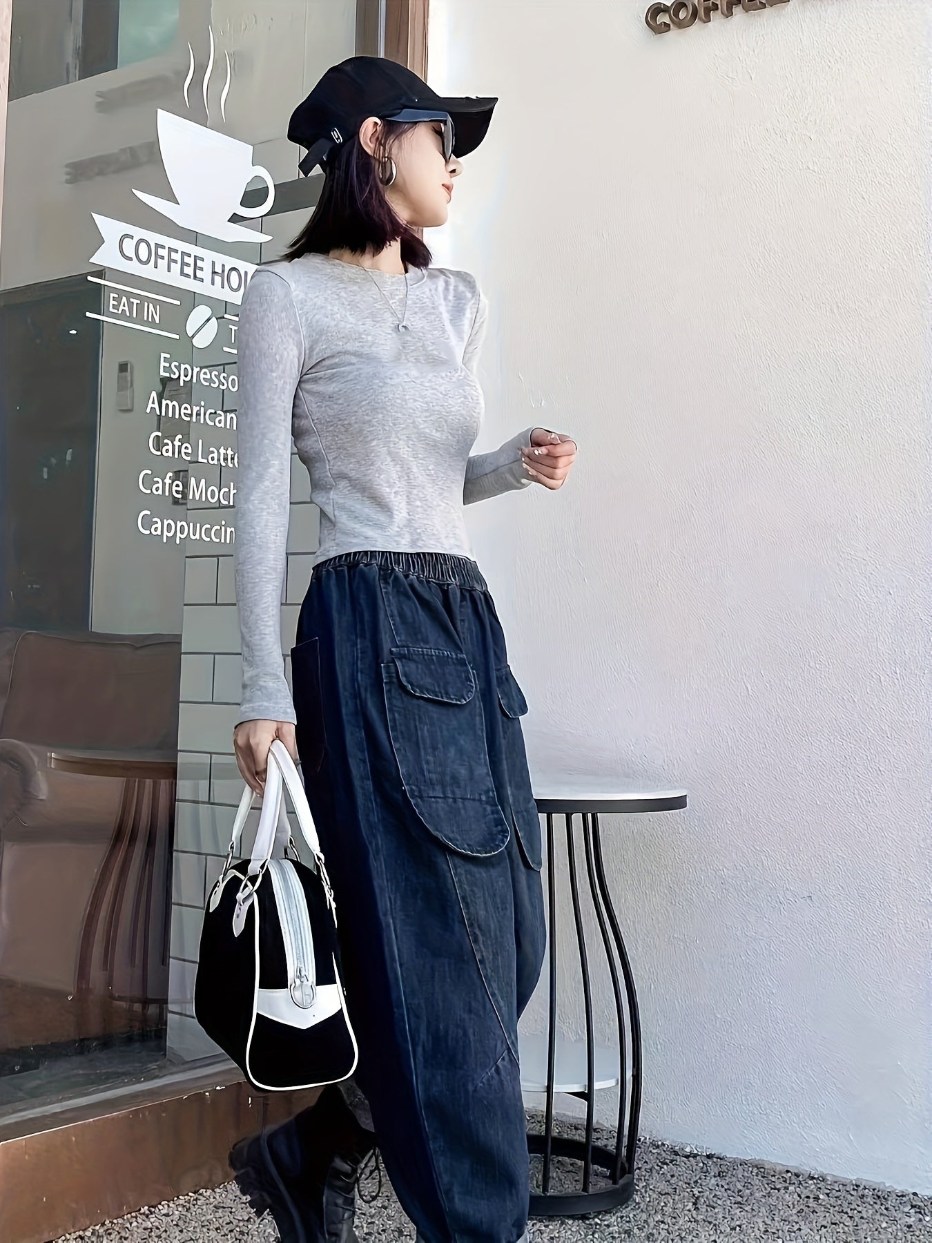 vlovelaw Elastic Waist Versatile Straight Jeans, Loose Fit Flap Pockets Washed Denim Pants, Women's Denim Jeans & Clothing