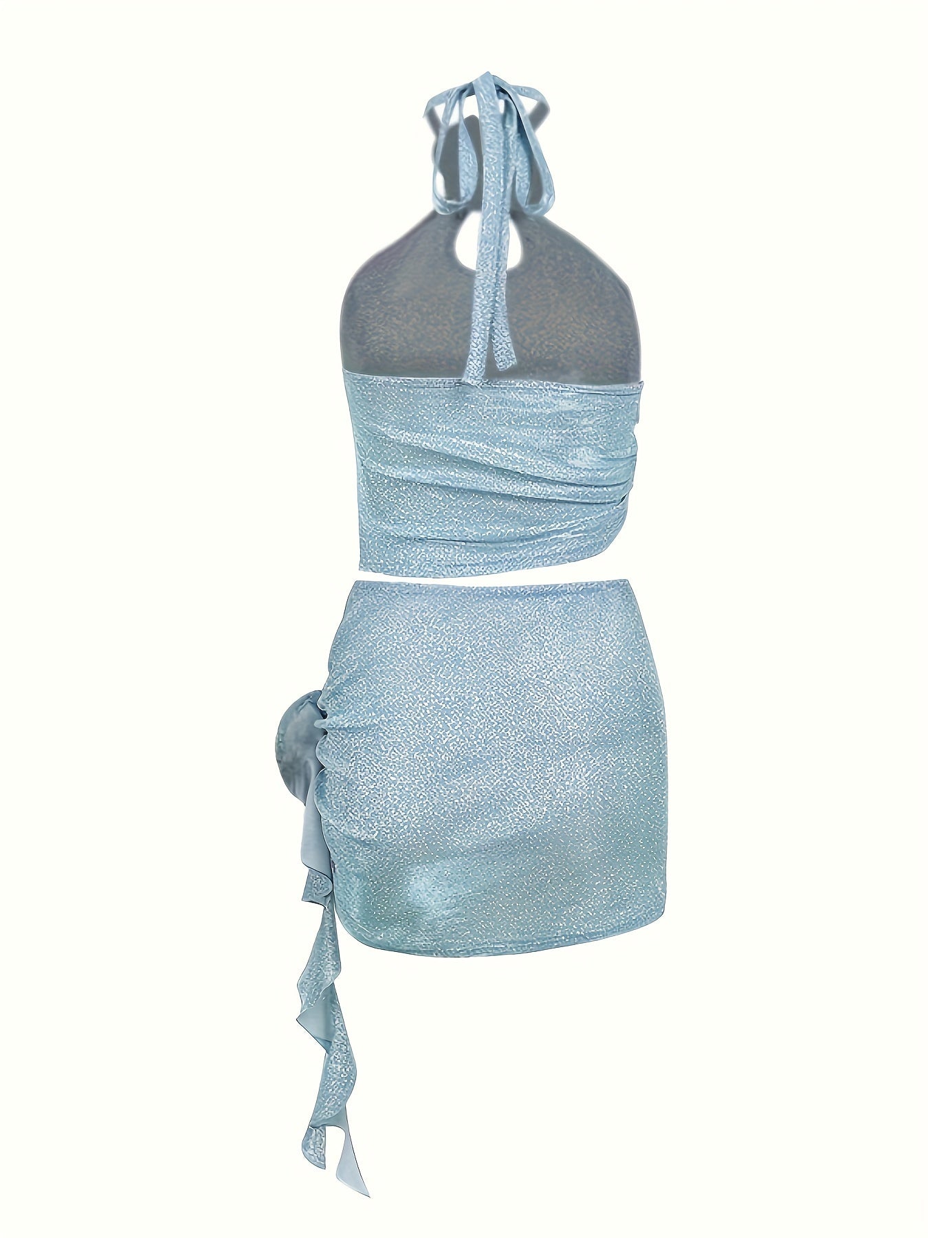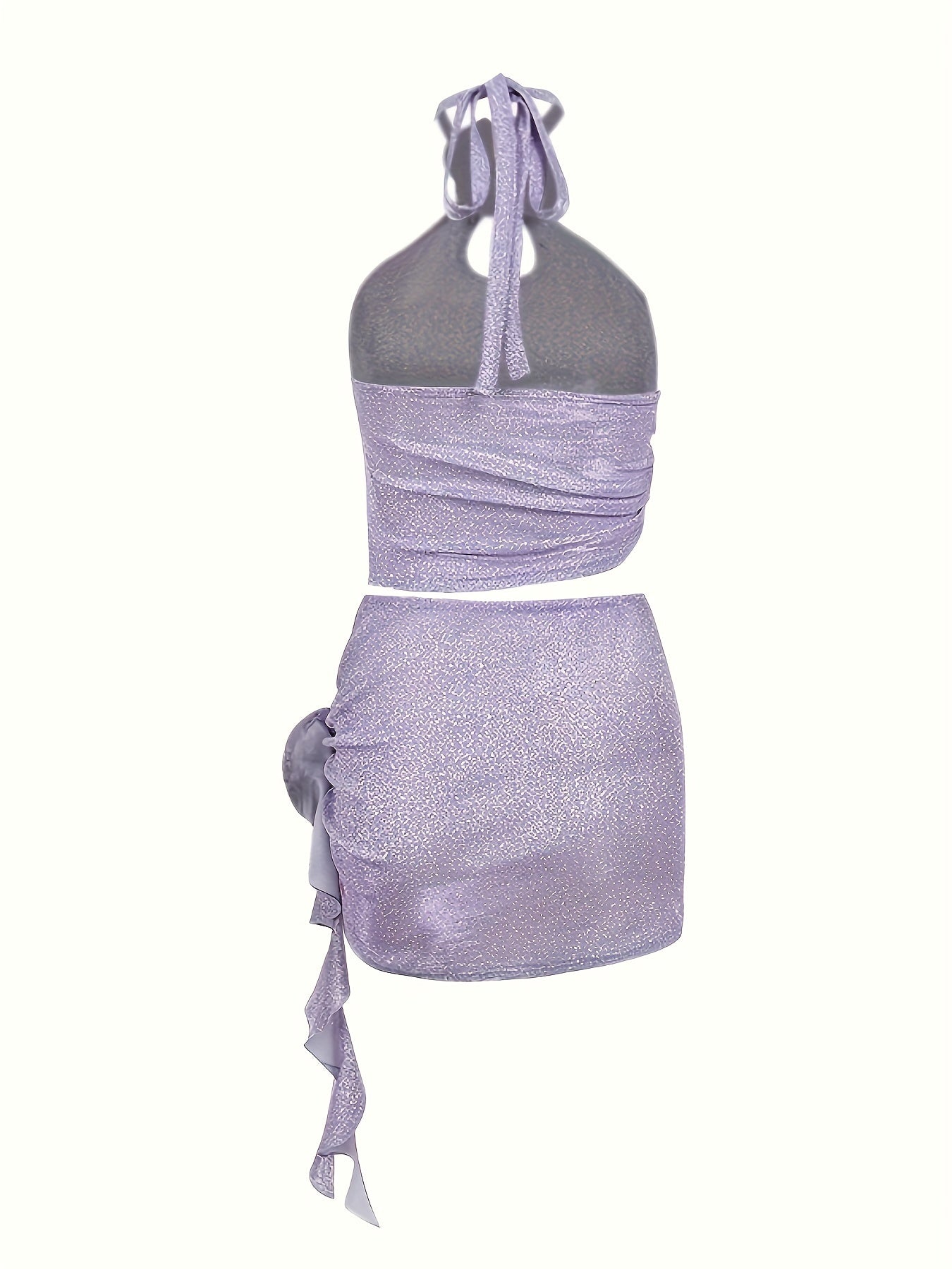 vlovelaw Floral Decor Two-piece Skirt Set, Backless Halter Neck Top & Skinny Ruffle Decor Mini Skirt Outfits, Women's Clothing