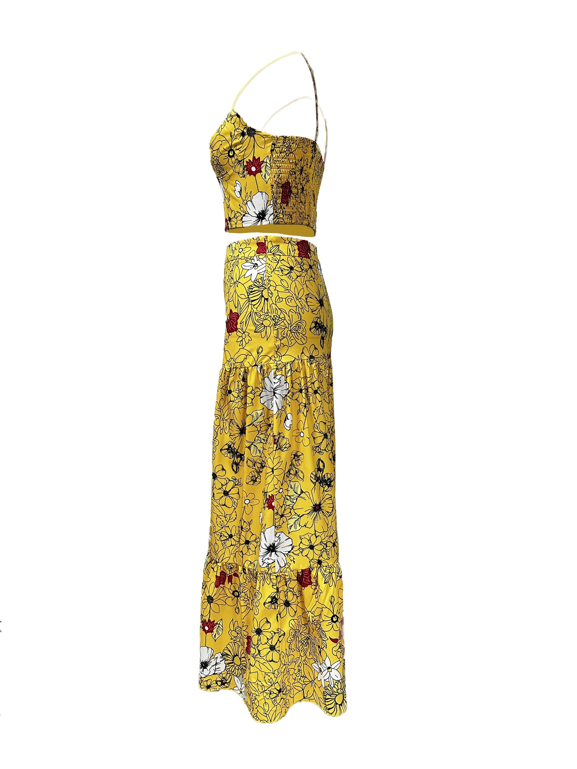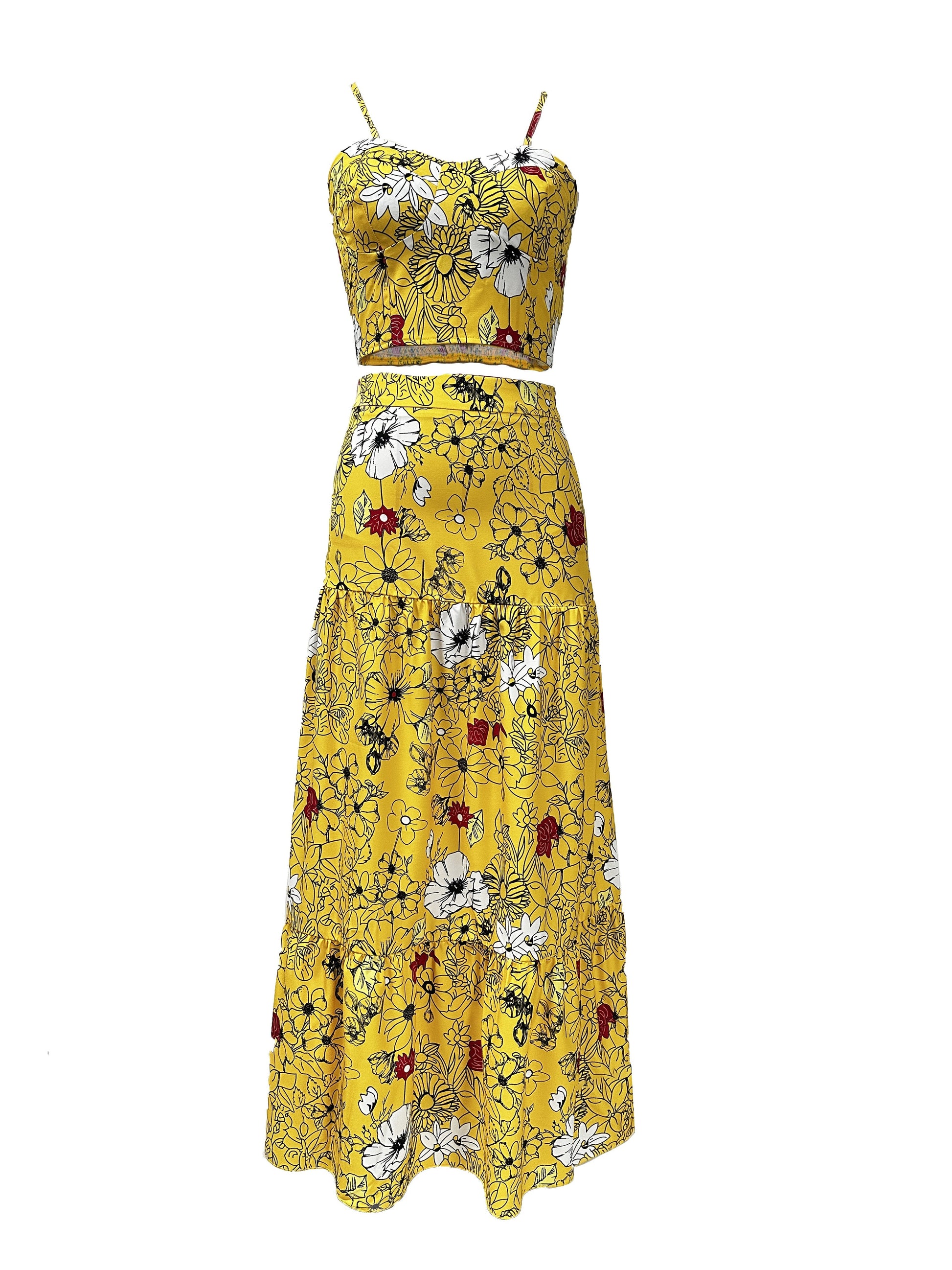 vlovelaw Floral Print Two-piece Skirt Set, Crop Cami Top & Maxi Length A-line Skirt Outfits, Women's Clothing
