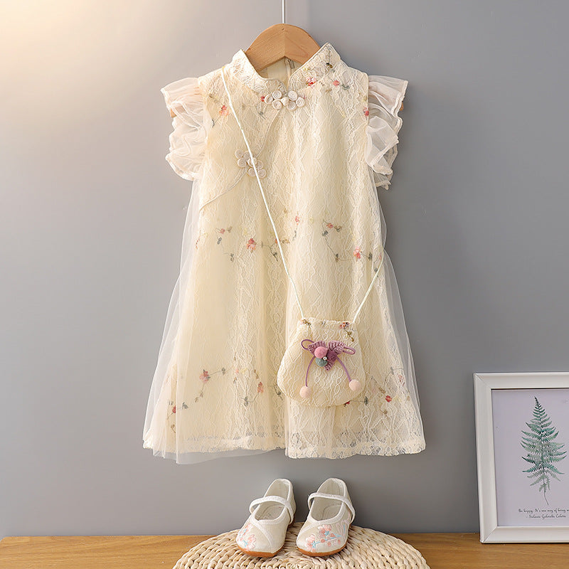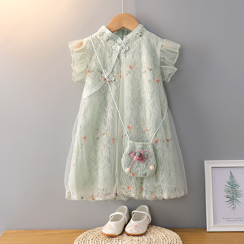 VLOVELAW Girls Cheongsam Summer Hanfu Girl Backpack Lace Elegant Chinese Style Jacket and Dress Baby Tang Costume