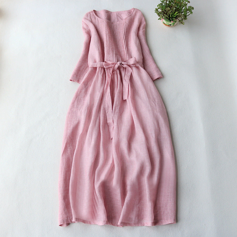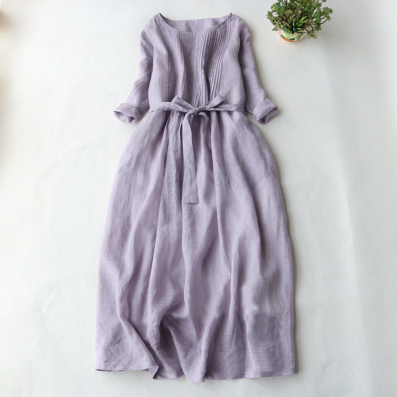 VLOVELAW Lace-up Waist-Controlled Slimming Half-Length Sleeve Dress Women's Summer New Cotton and Linen Art Elegant Organ Pleated Skirt