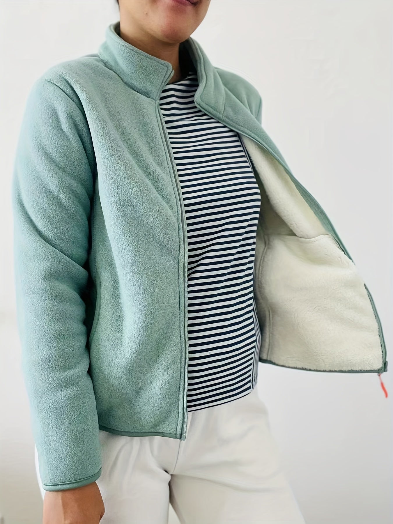 vlovelaw Plain Fleece Liner Outdoor Jacket, Full Zipper Long Sleeves Mock Neck For Hiking Sports Coat, Women's Activewear